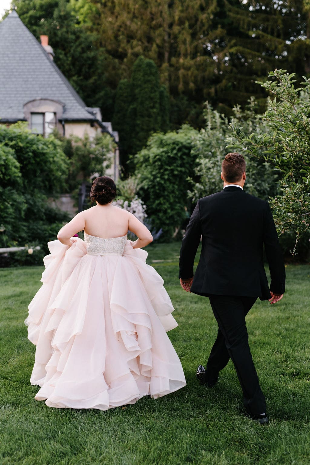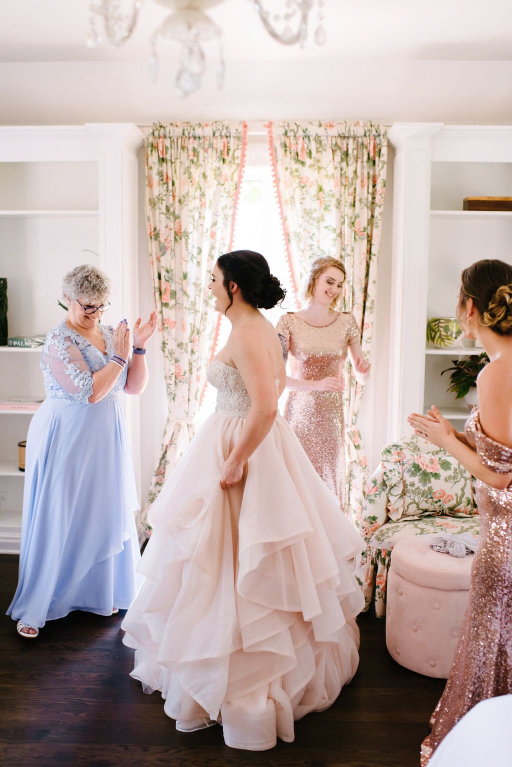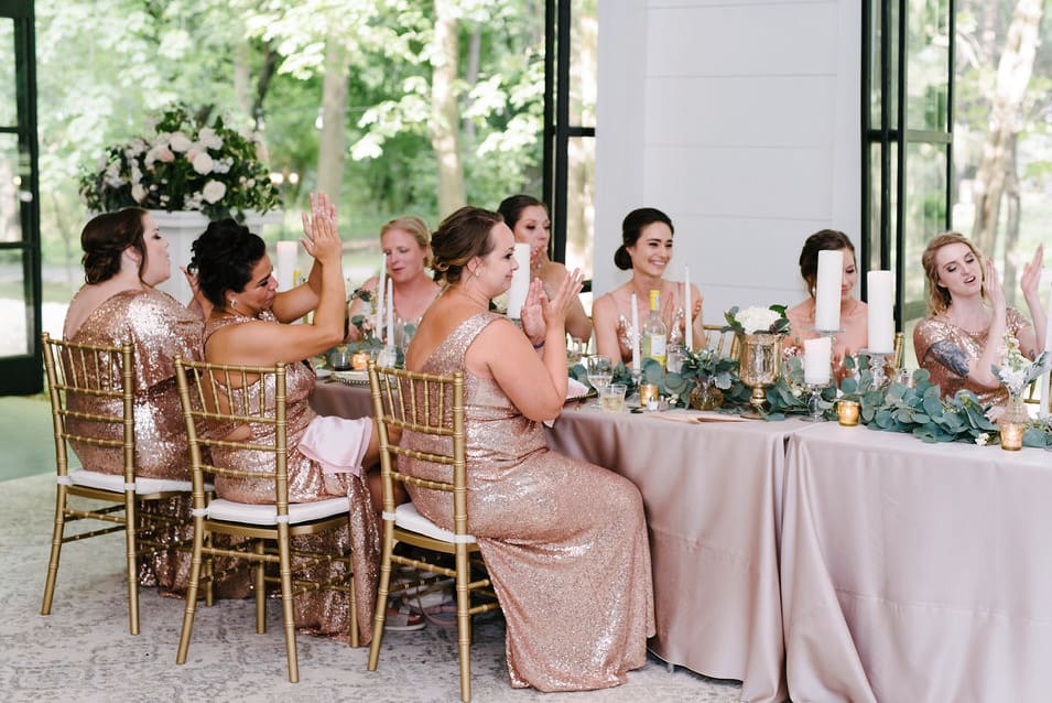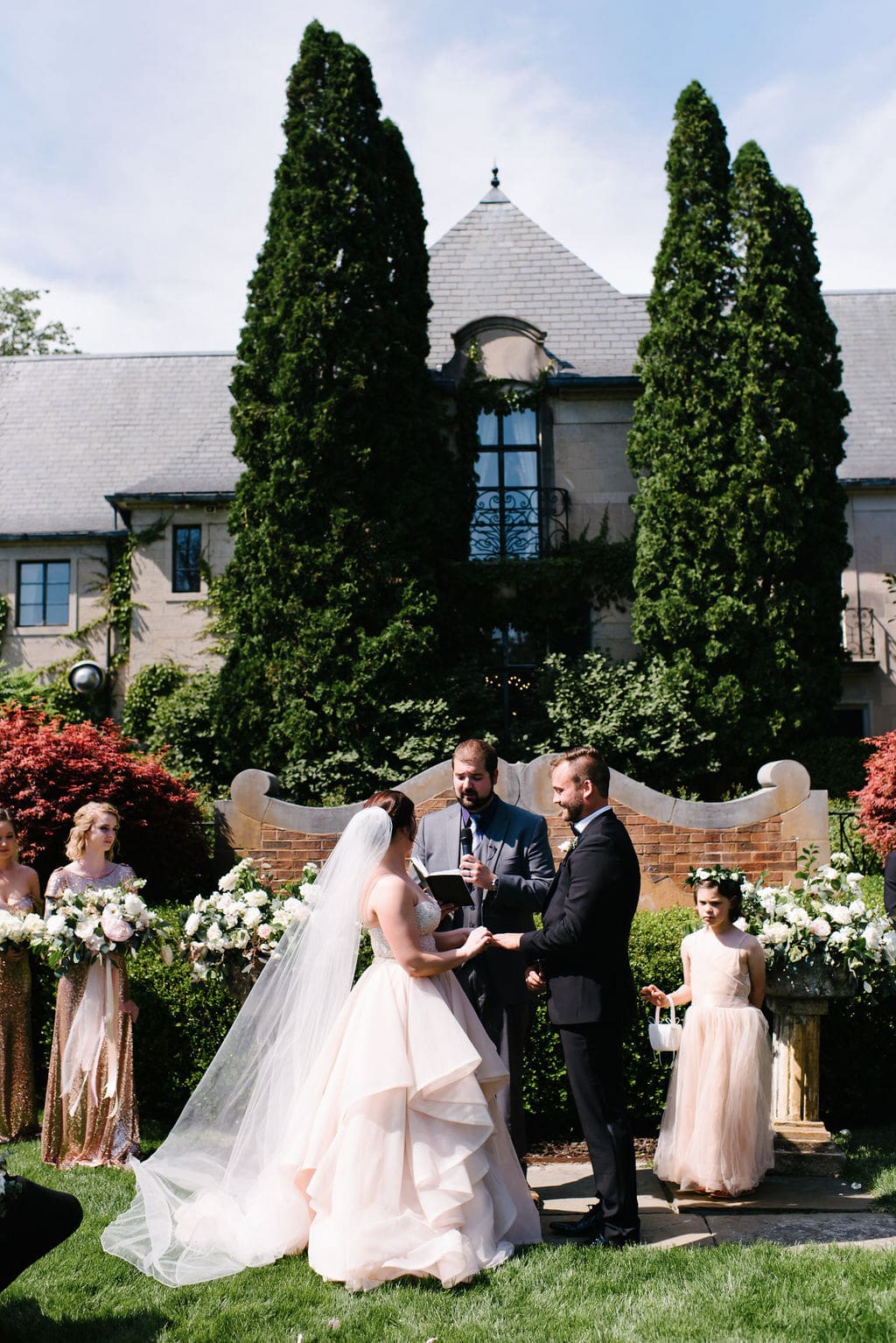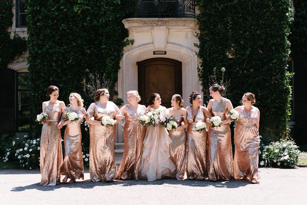 The delicate pink tones blended seamlessly with the bridesmaids’ sequined dresses, creating a cohesive and elevated aesthetic. Portraits taken throughout the manor’s lush gardens and ivy-filled walls added to the grandeur and timeless feel of the celebration.