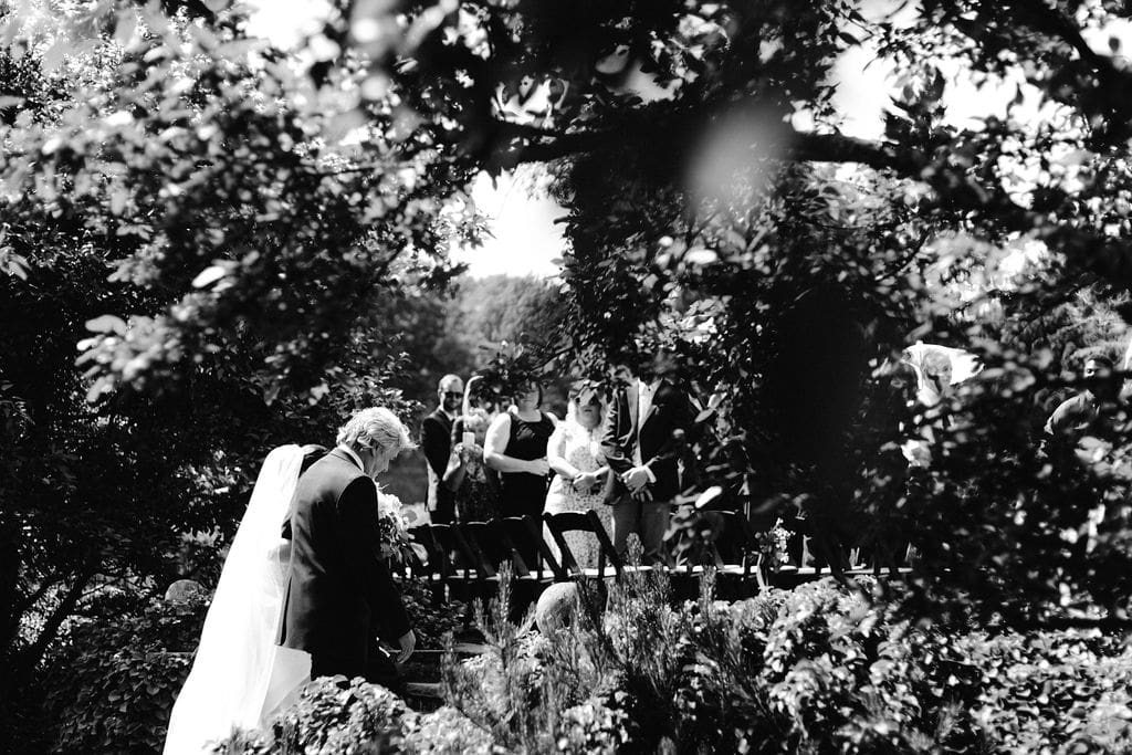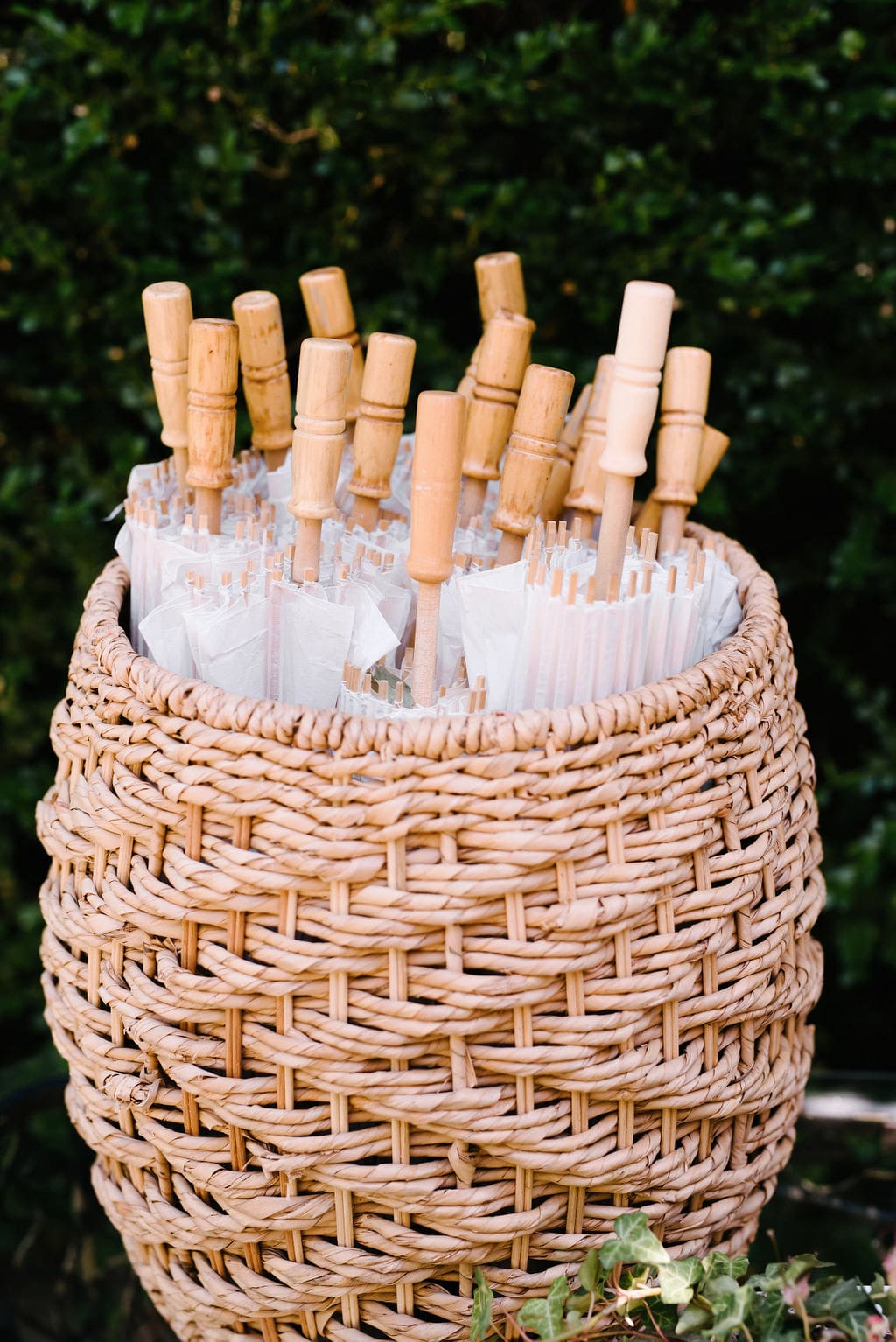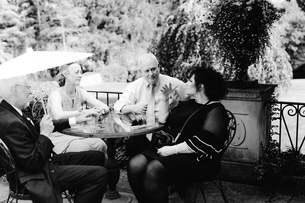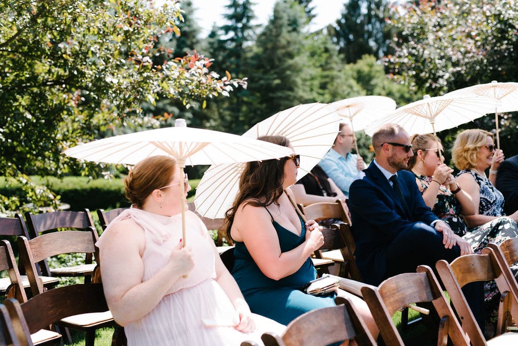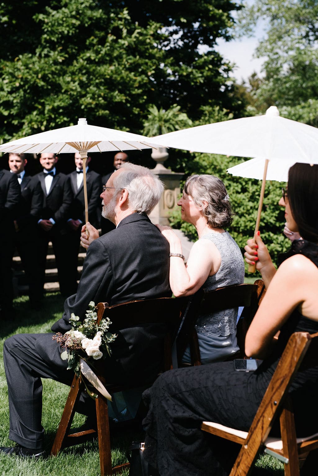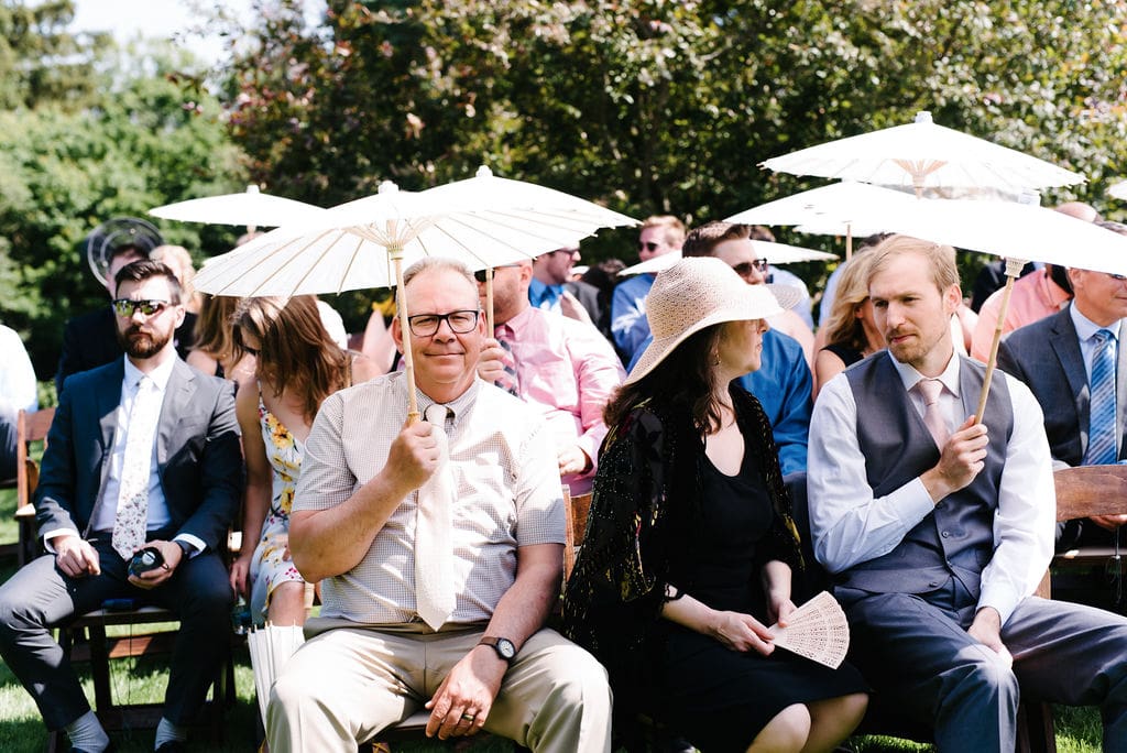 To keep guests comfortable, parasols and personalized fans were provided during this warm summer wedding day. An open-air cocktail hour followed, filled with warm embraces, laughter, and beautifully presented appetizers, allowing guests to fully enjoy the manor’s picturesque grounds.