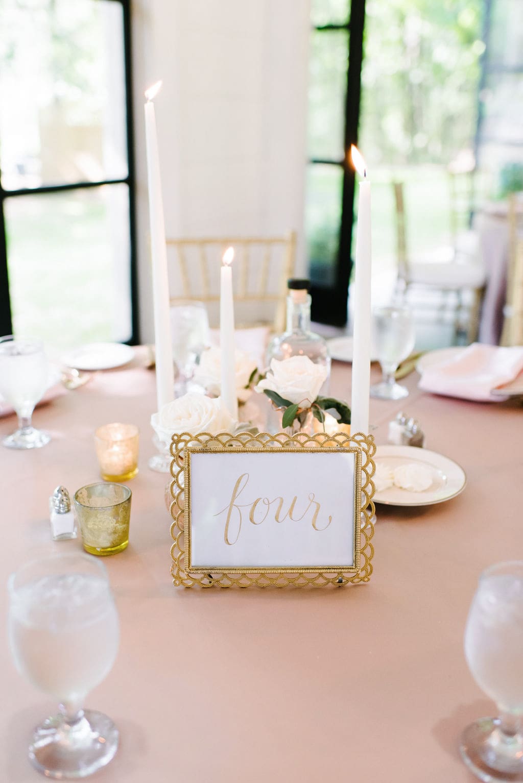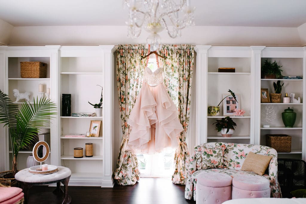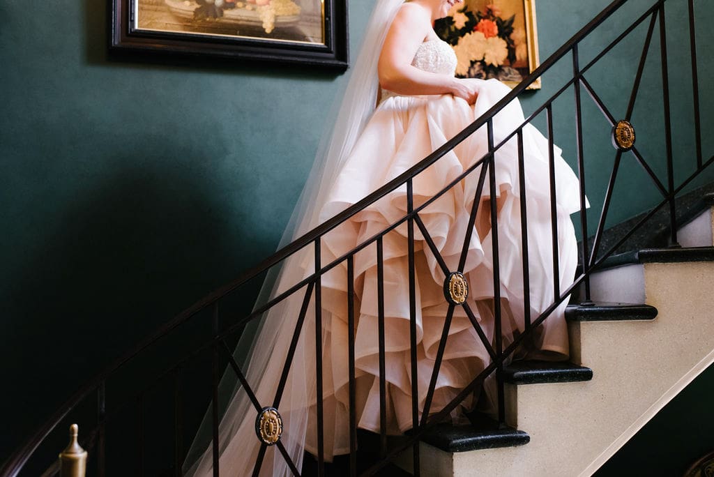 The morning began with Refeyeance Beauty, who pampered the bridal party with flawless hair and makeup. Kara’s mother helped her into a soft pink, two-piece Martina Liana gown from Bella Bianca Bridal Gallery. This unique and modern bridal look beautifully complemented the day’s color palette.