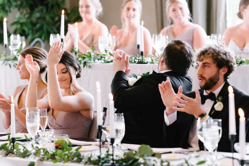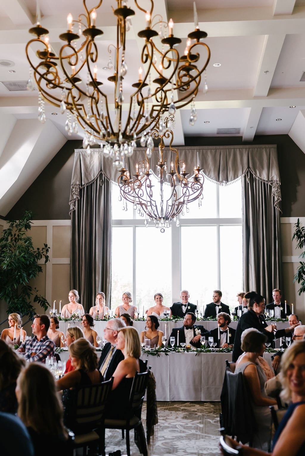 Upon entering their stunning, candlelit reception at Cascade Hills Country Club, Sarah and Andrew poured a champagne tower together alongside their bridal party. This set the tone for a celebration filled with laughter, heartfelt speeches, and a delicious dinner.