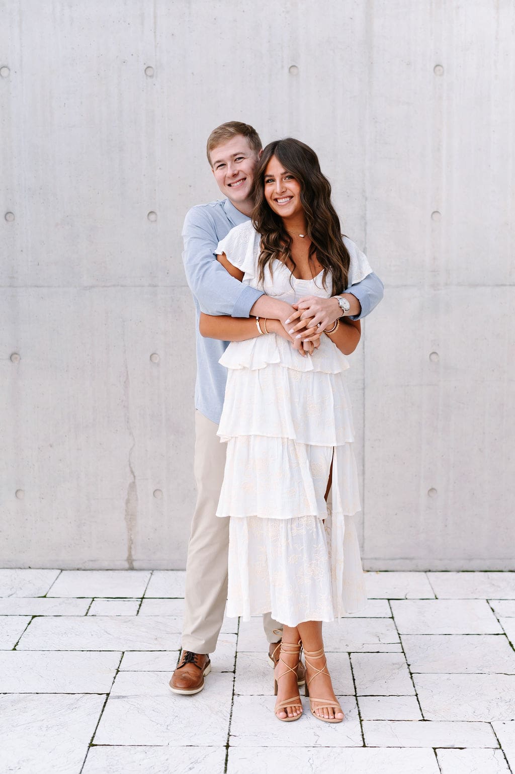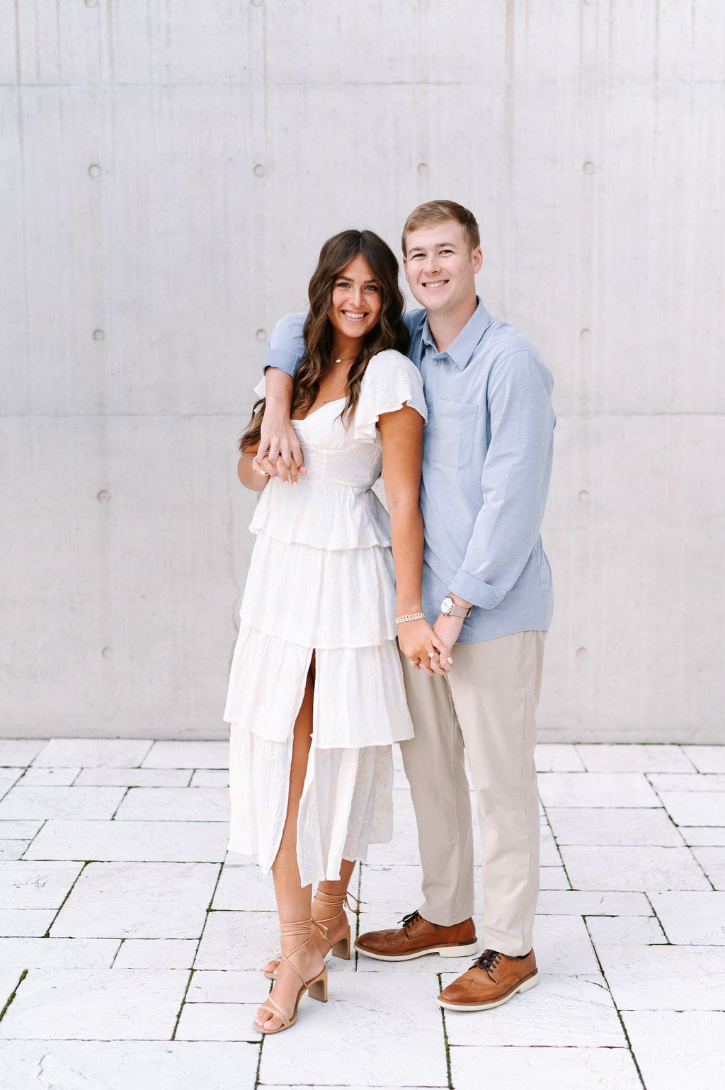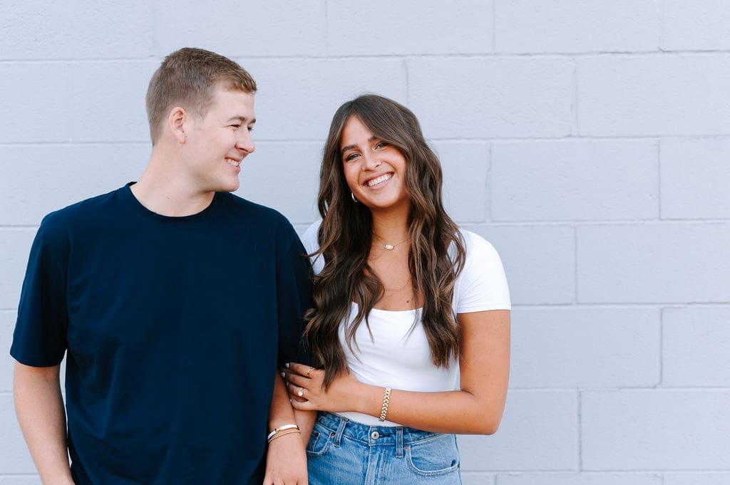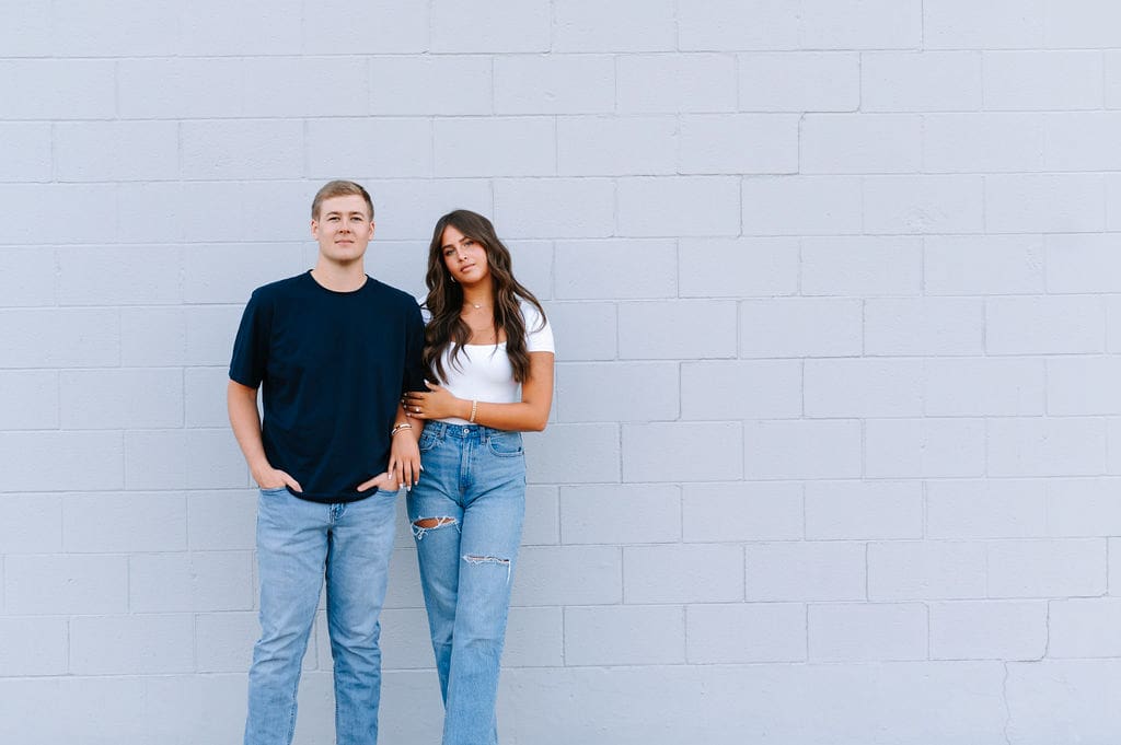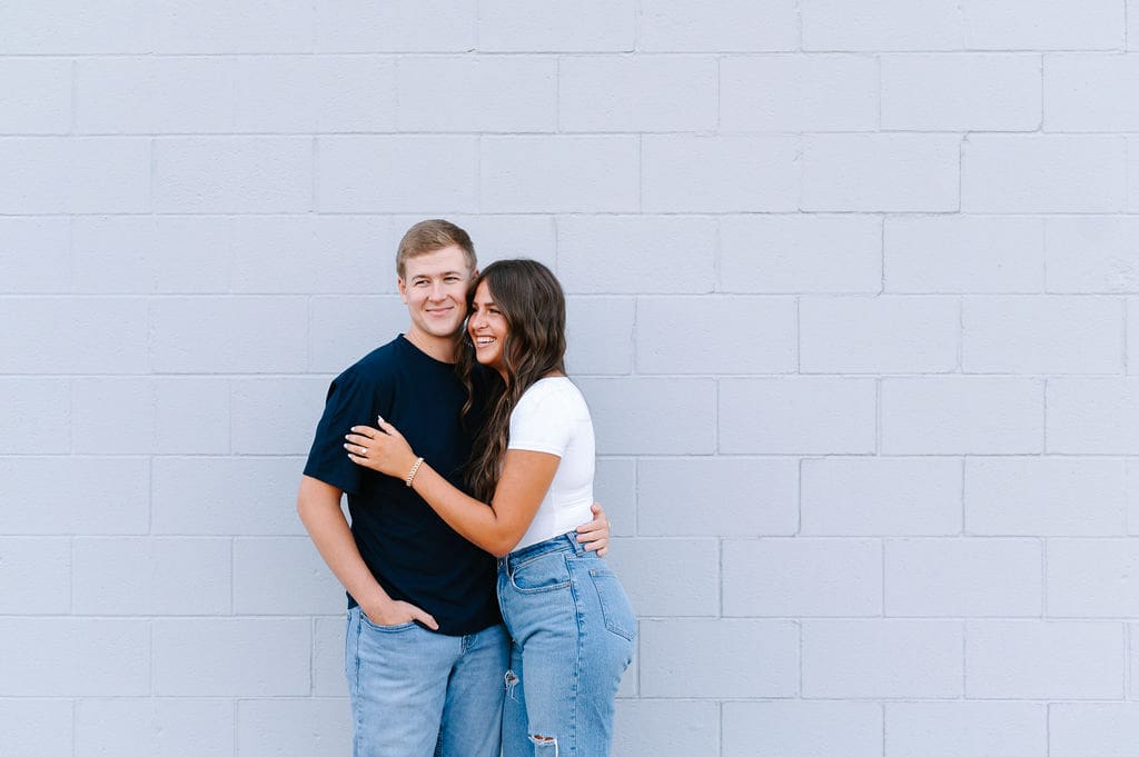 Isabel wanted their engagement session to echo their Venue3Two garden wedding color palette. We found a pastel blue wall that fit the exact vision and their outfits complemented perfectly.