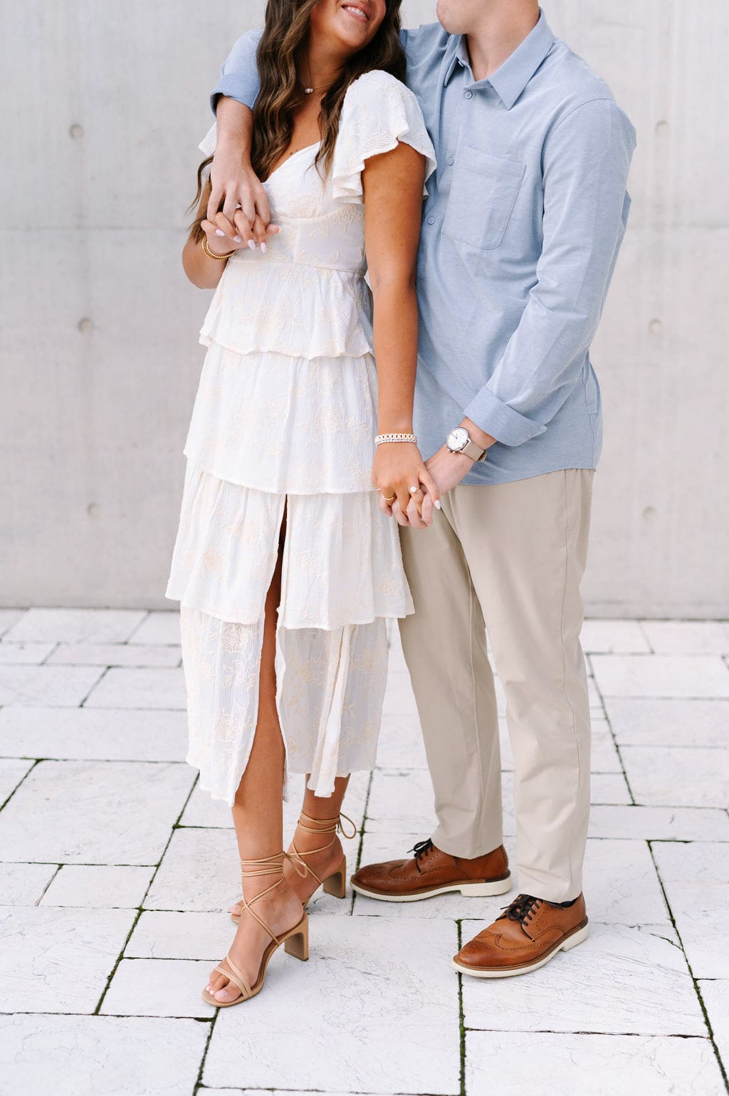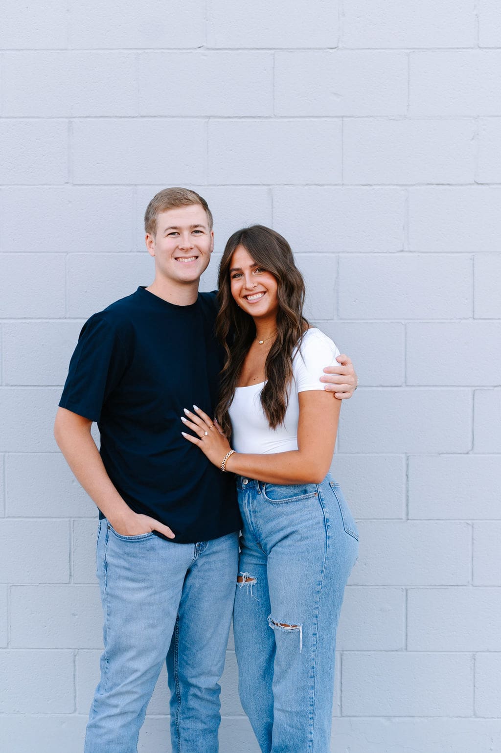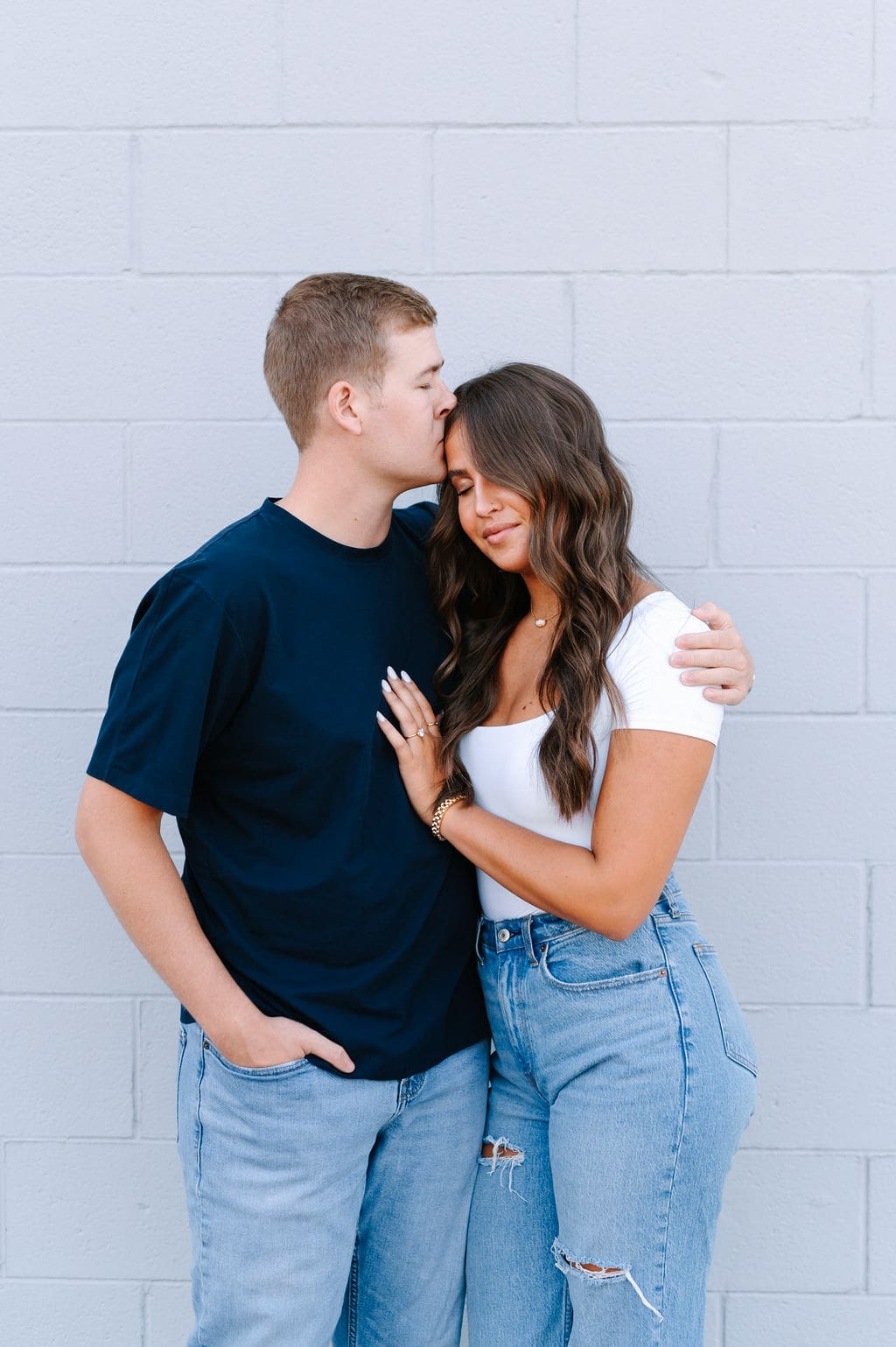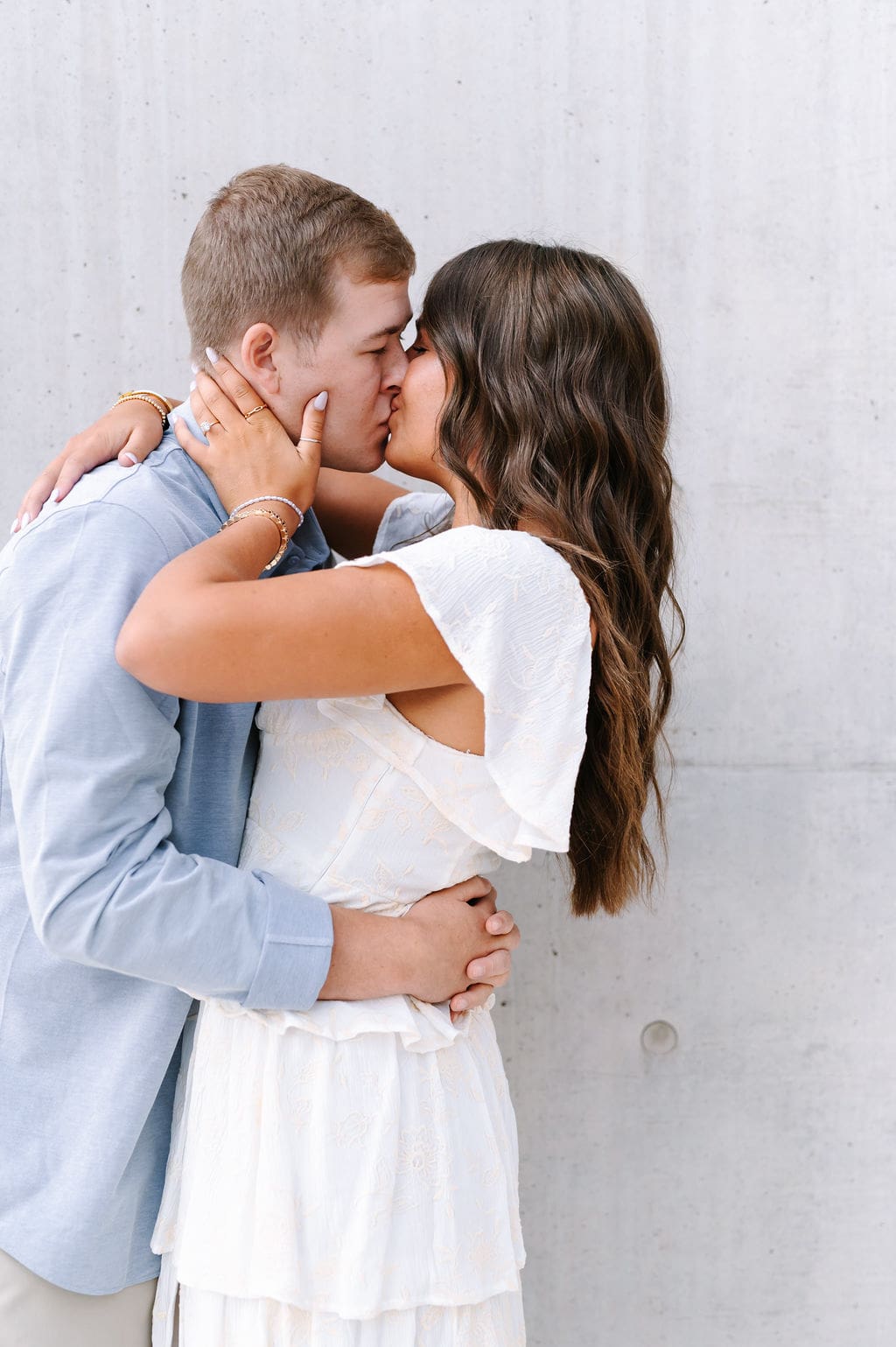 Isabel wanted their engagement session to echo their Venue3Two garden wedding color palette. We found a pastel blue wall that fit the exact vision and their outfits complemented perfectly.