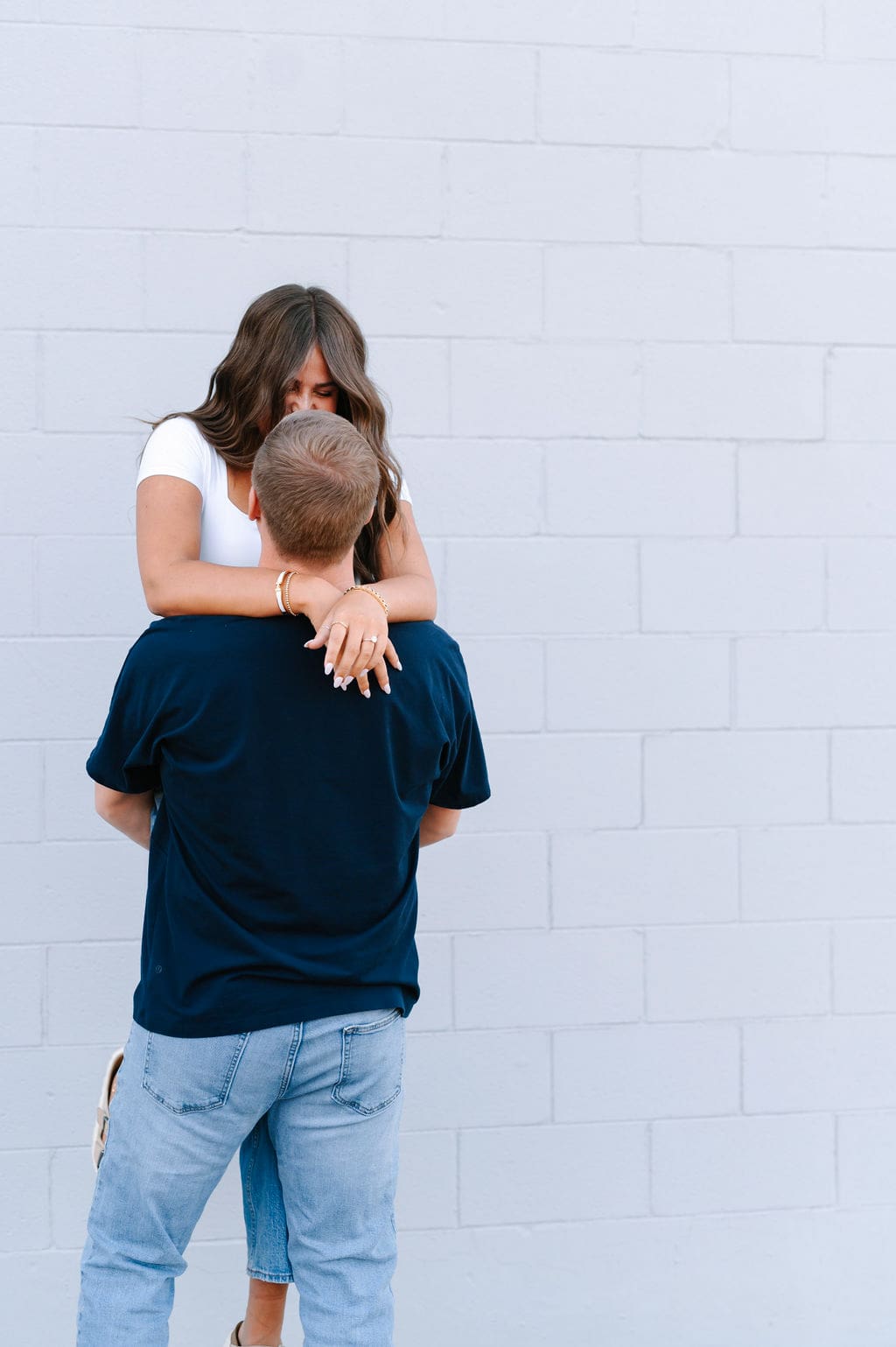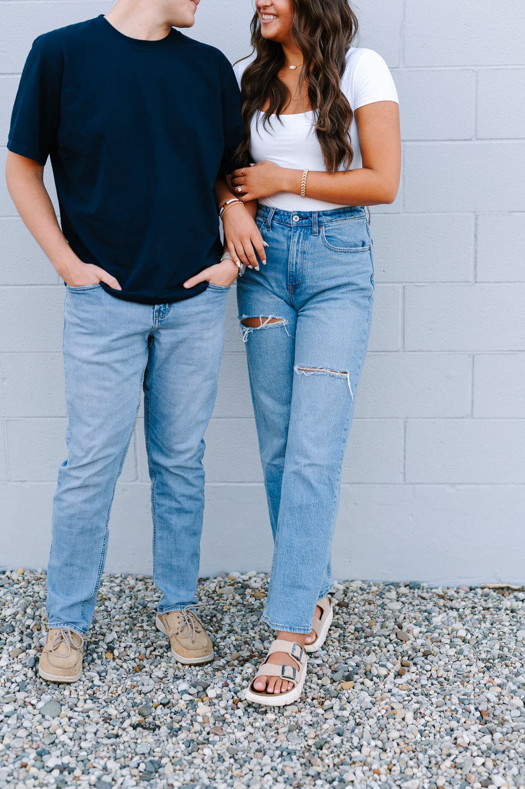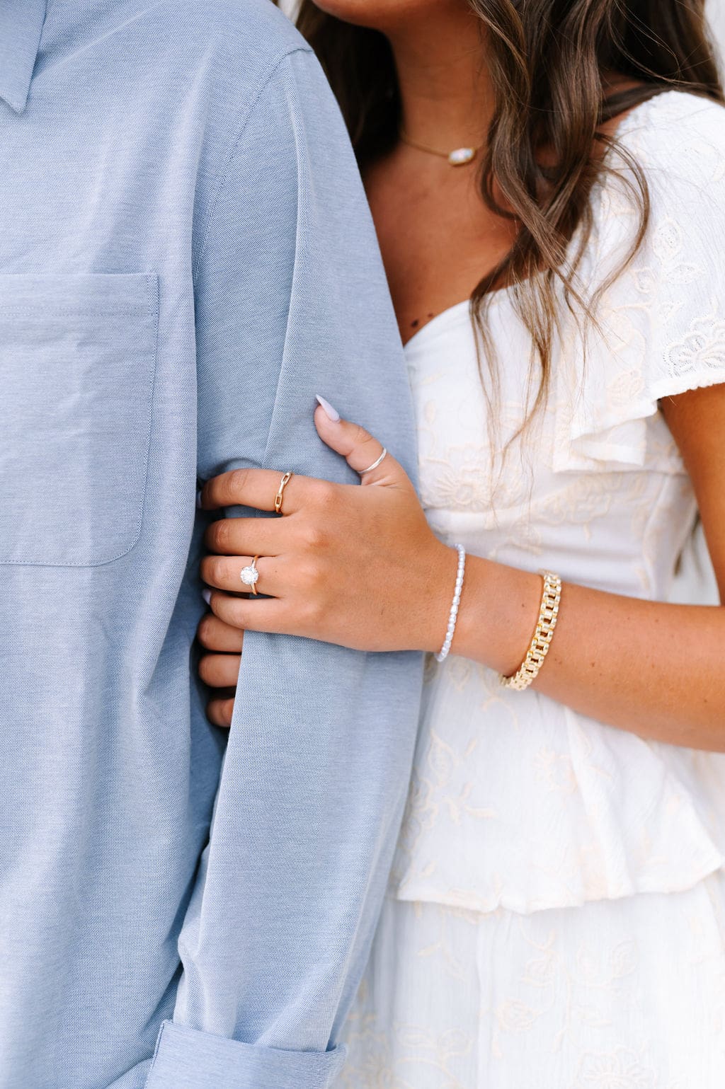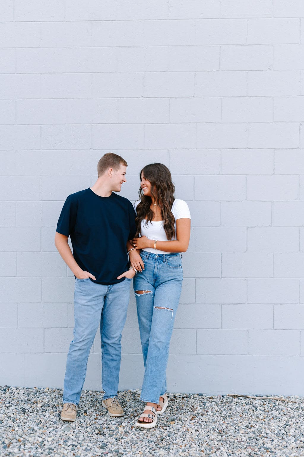 Isabel wanted their engagement session to echo their Venue3Two garden wedding color palette. We found a pastel blue wall that fit the exact vision and their outfits complemented perfectly.