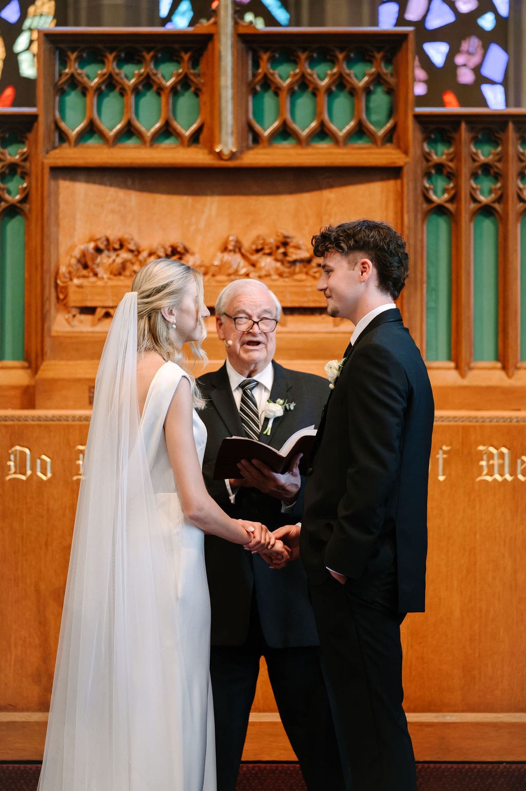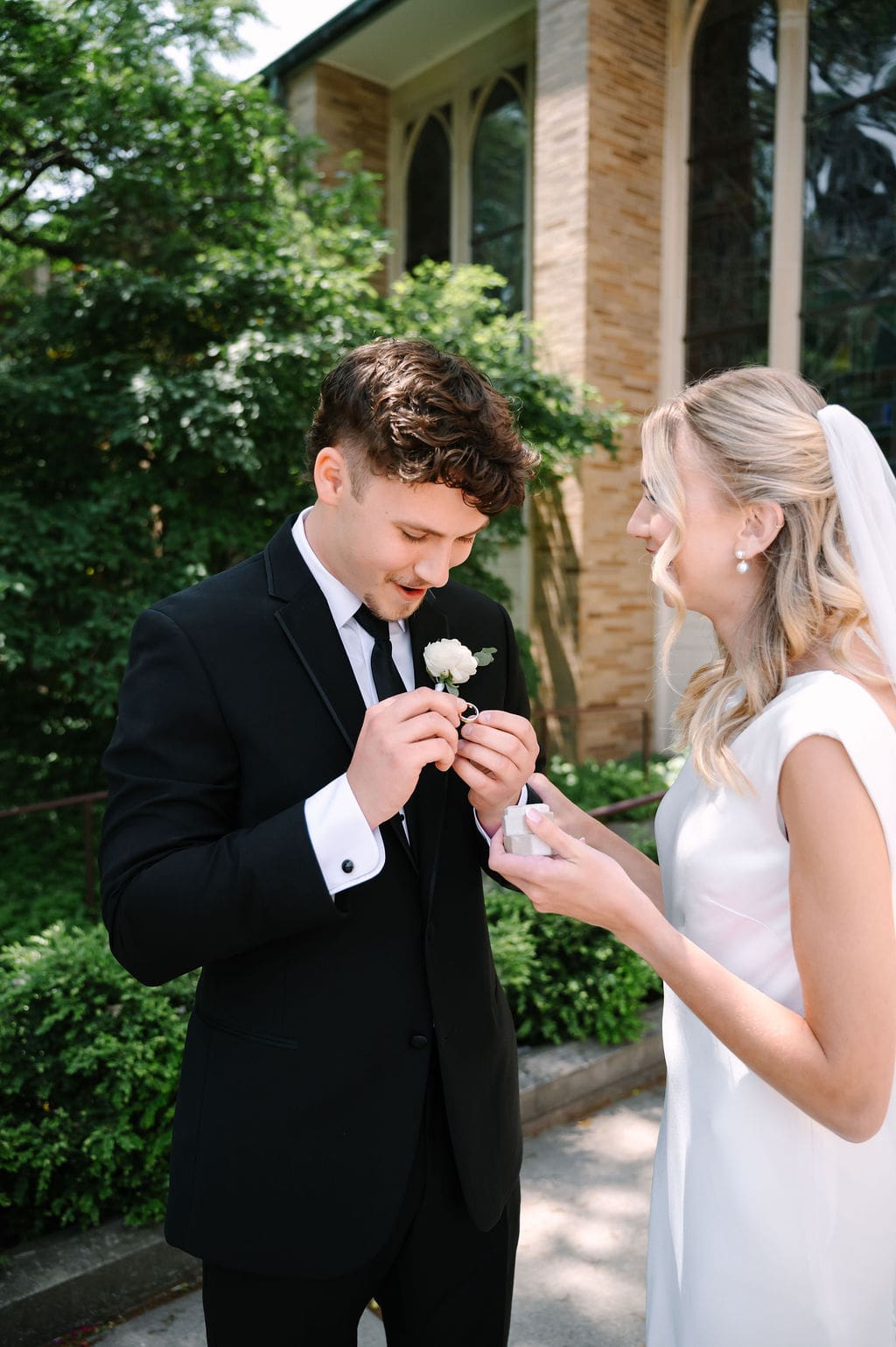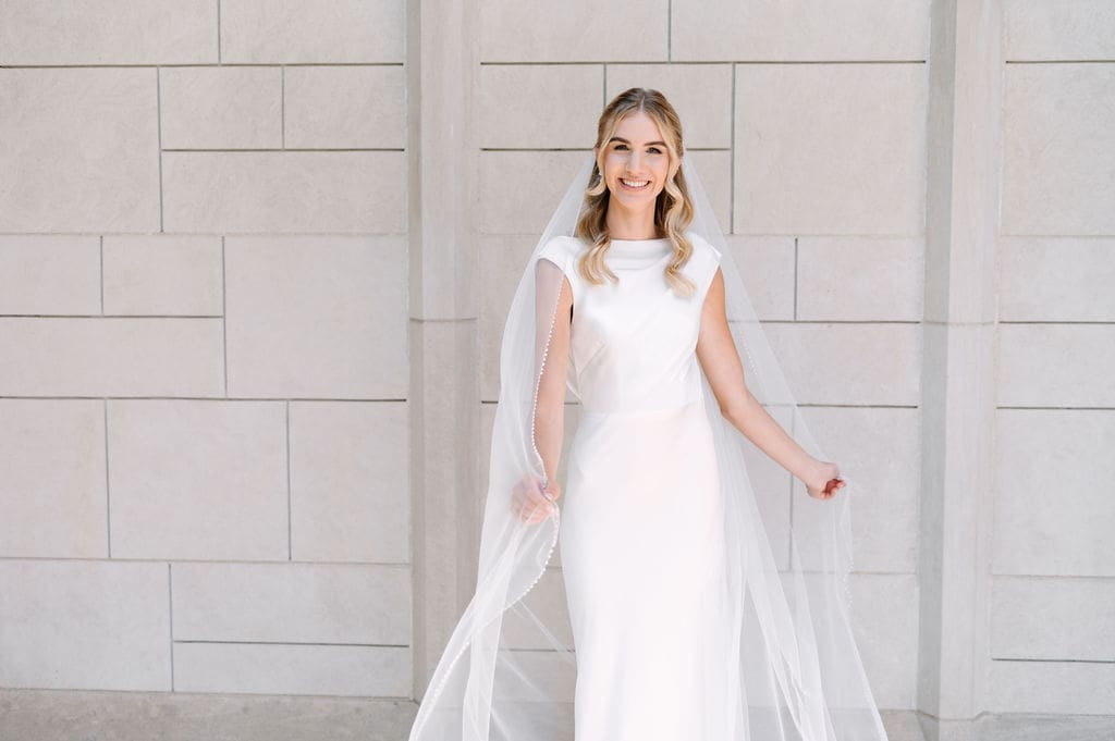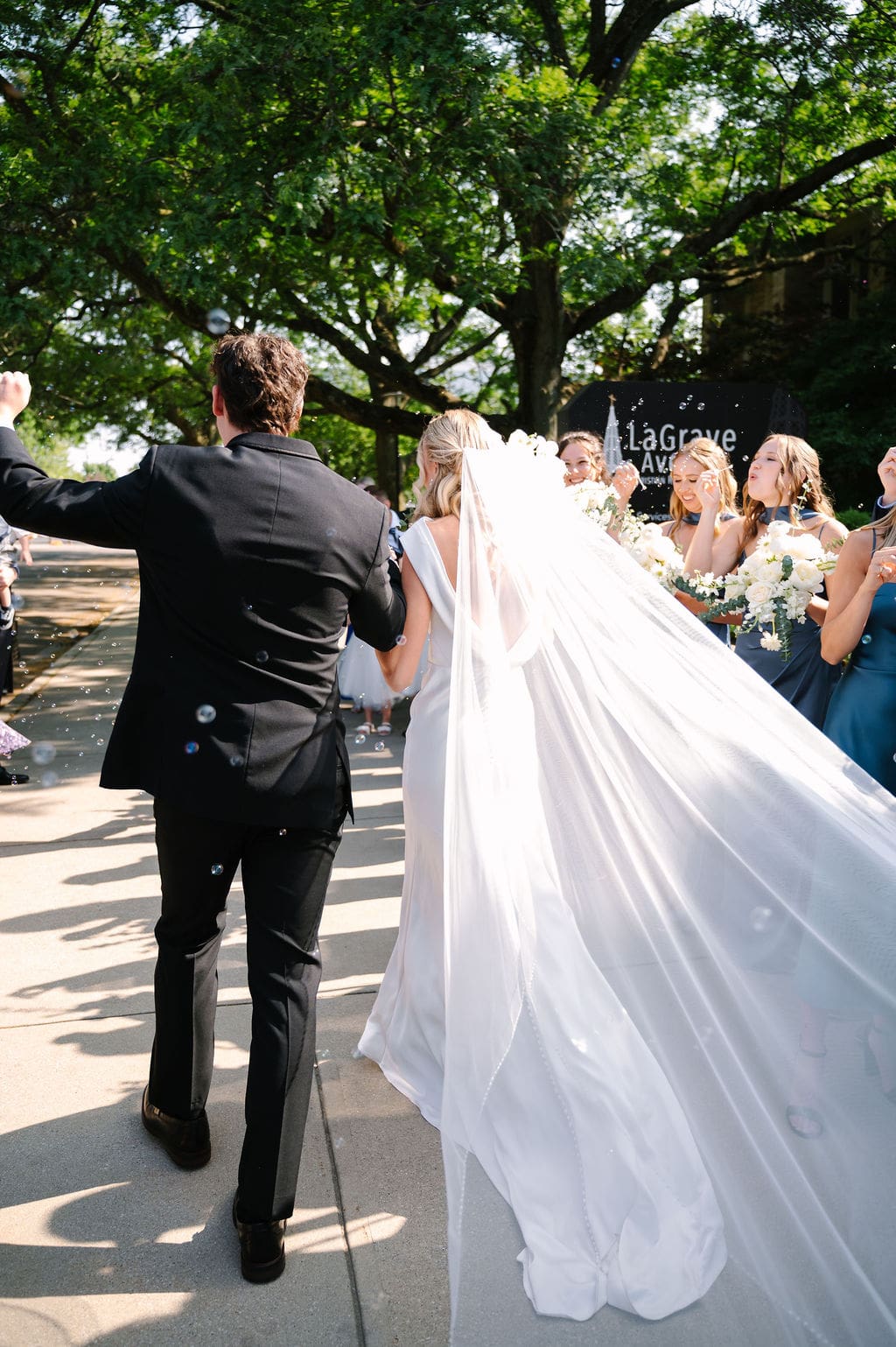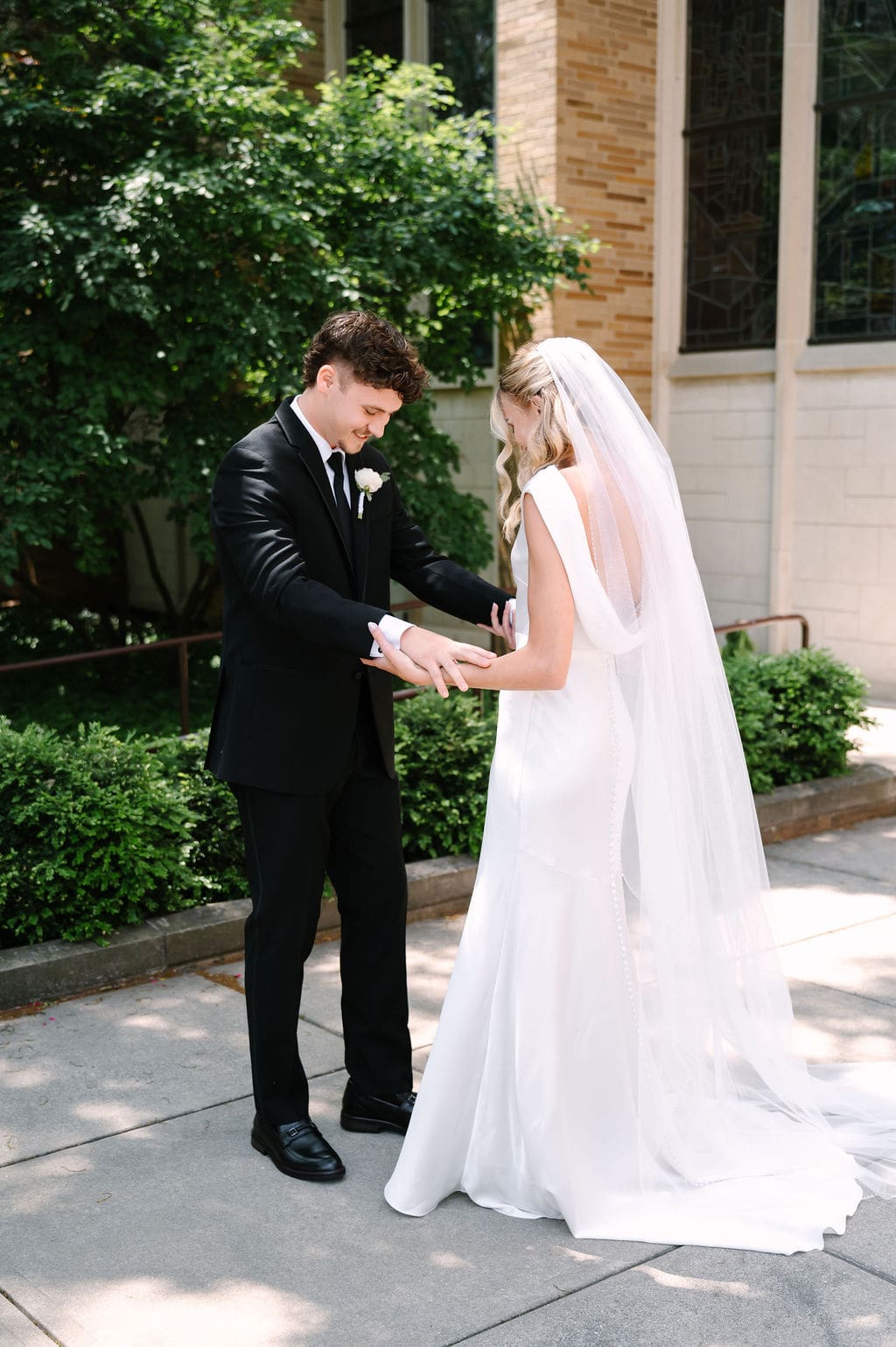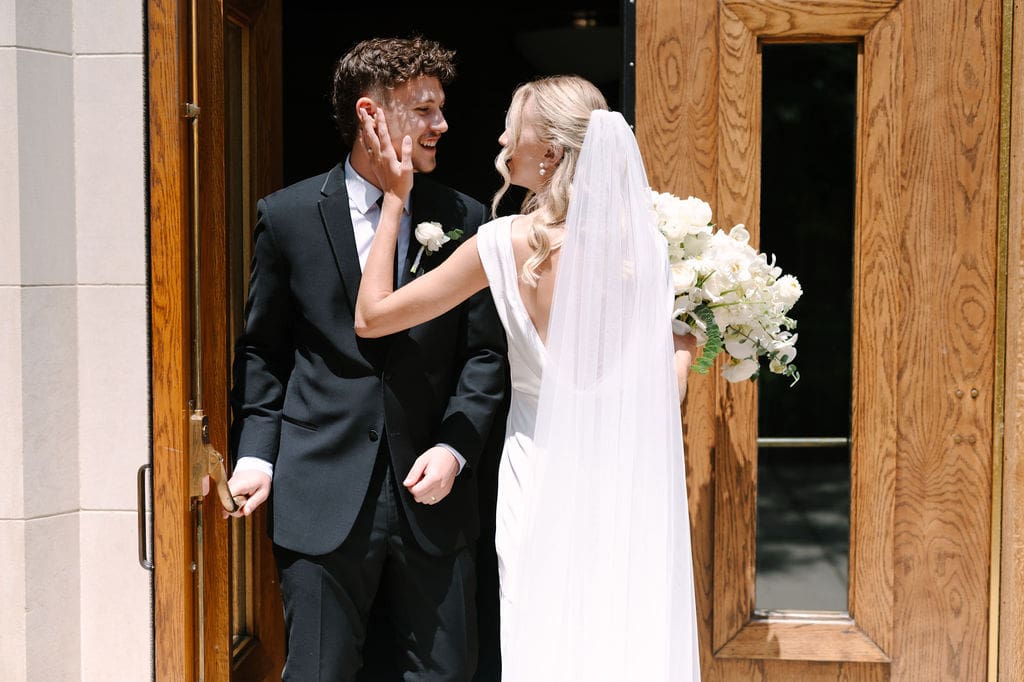 Back at LaGrave CRC, Kristyn’s mother helped her into a classic high-neck Anthropologie wedding gown, featuring an elegant draped back. She paired the gown with a cathedral veil from Renee Austin Wedding, completing a refined and timeless bridal look.