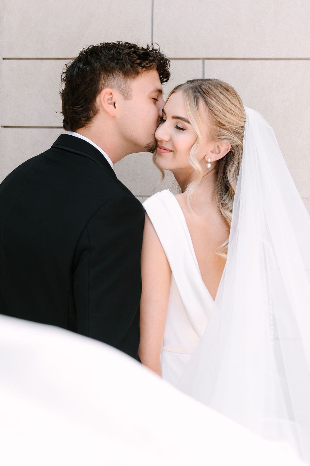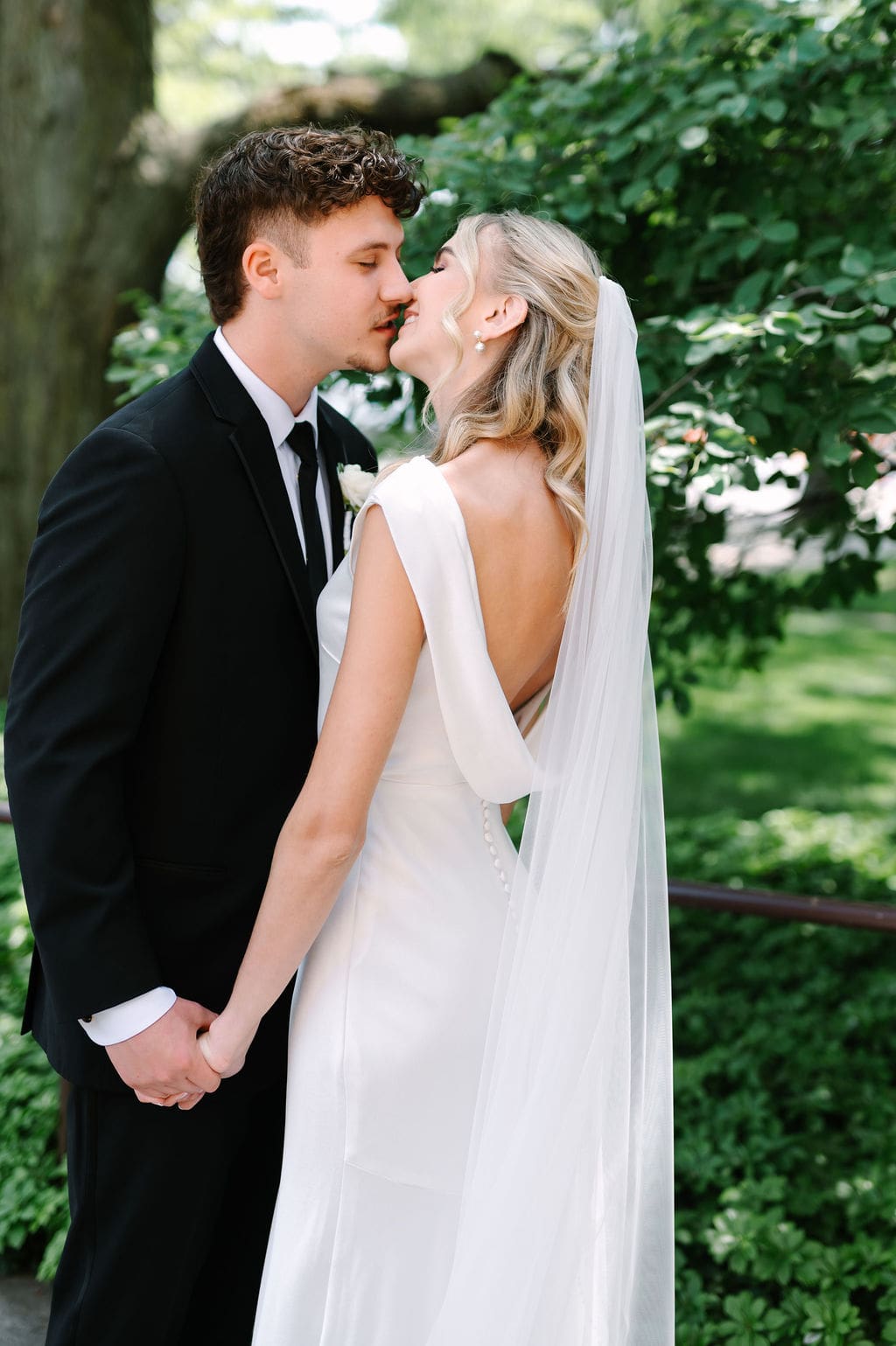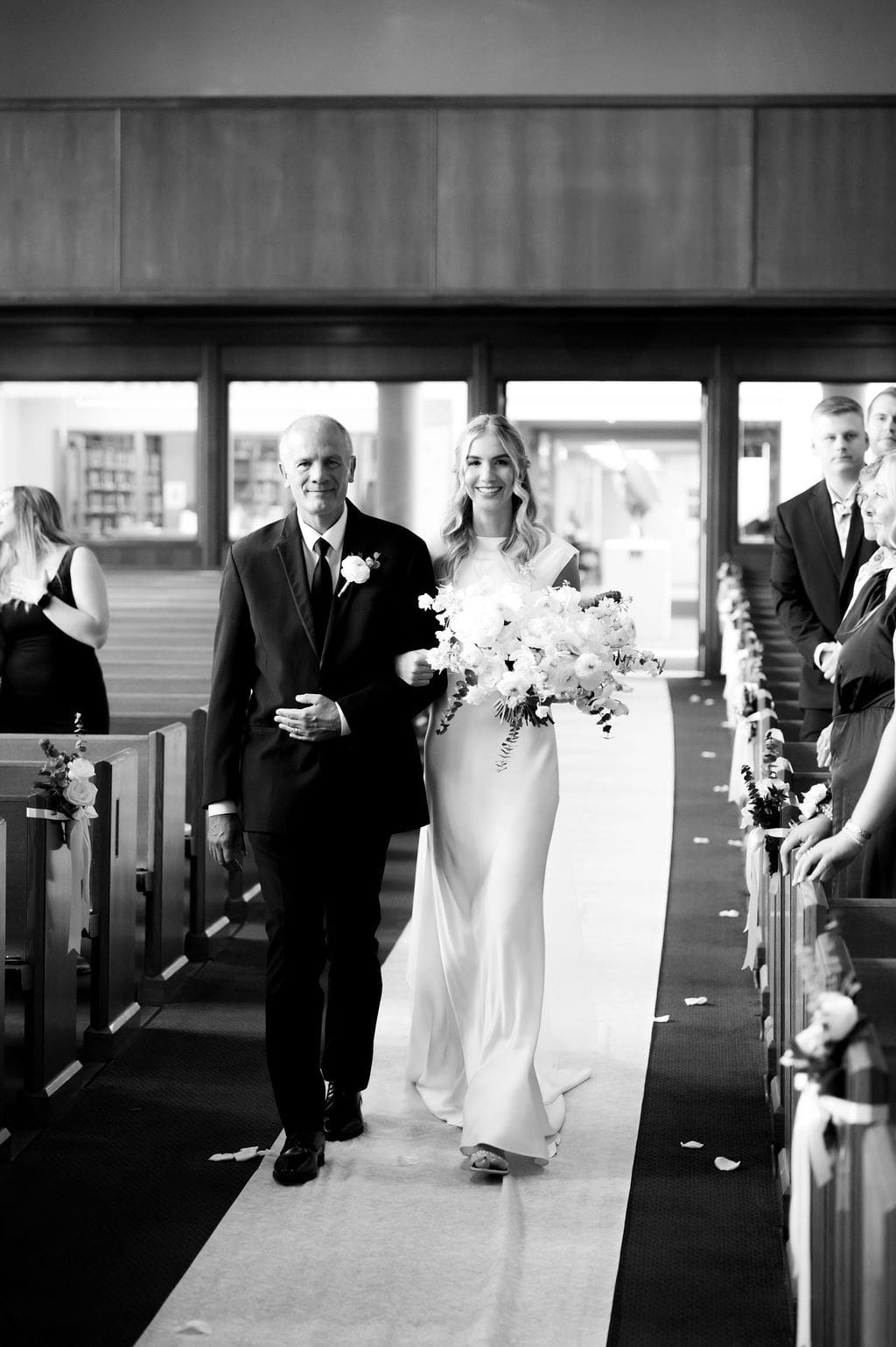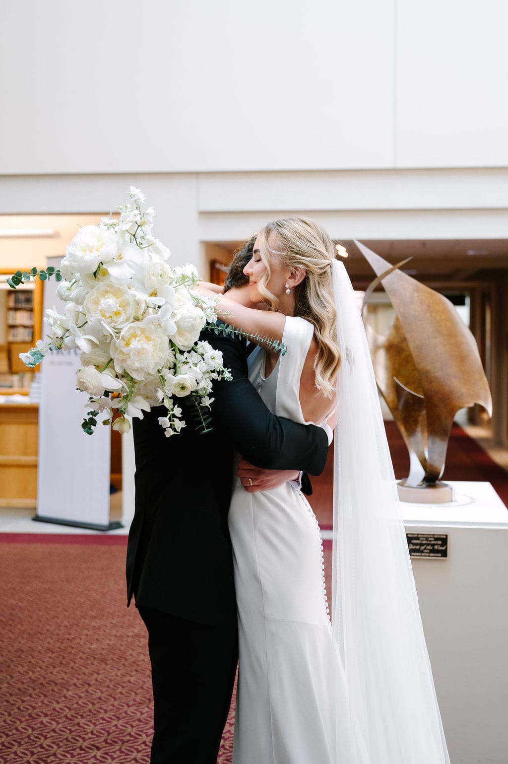 Back at LaGrave CRC, Kristyn’s mother helped her into a classic high-neck Anthropologie wedding gown, featuring an elegant draped back. She paired the gown with a cathedral veil from Renee Austin Wedding, completing a refined and timeless bridal look.