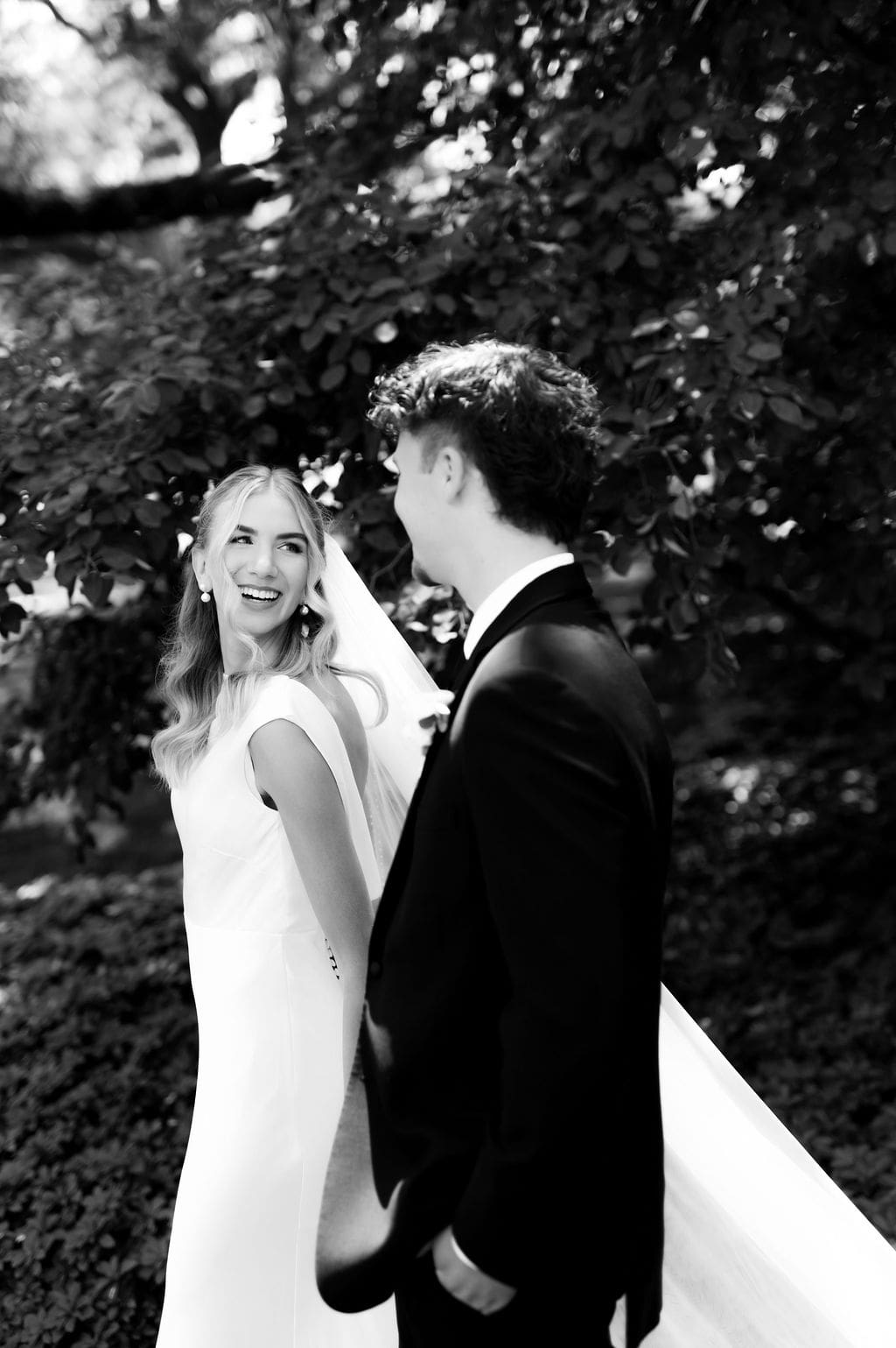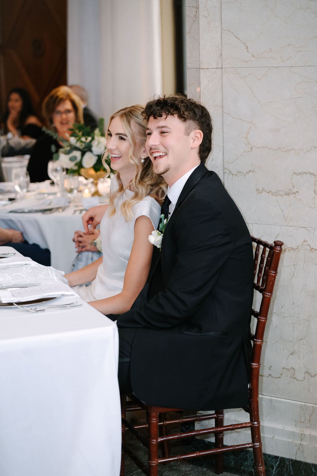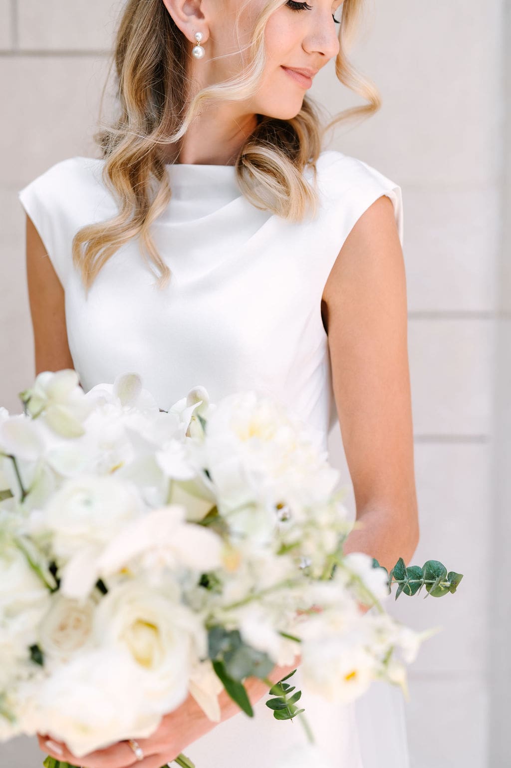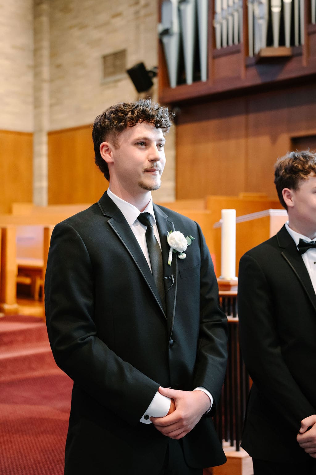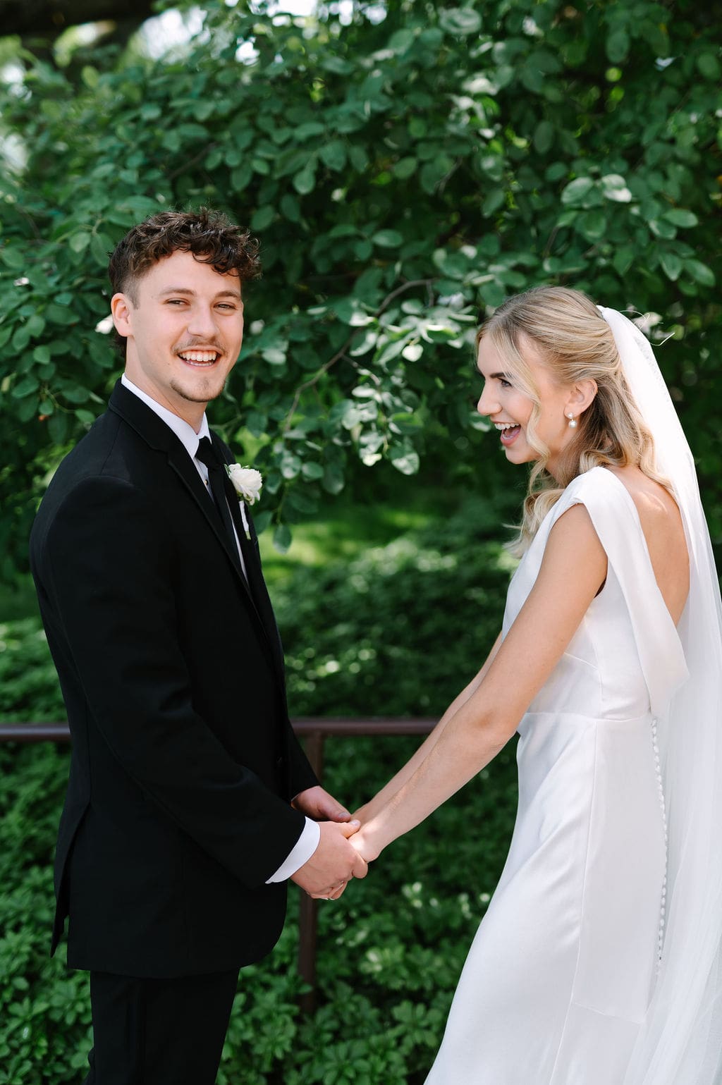 Back at LaGrave CRC, Kristyn’s mother helped her into a classic high-neck Anthropologie wedding gown, featuring an elegant draped back. She paired the gown with a cathedral veil from Renee Austin Wedding, completing a refined and timeless bridal look.