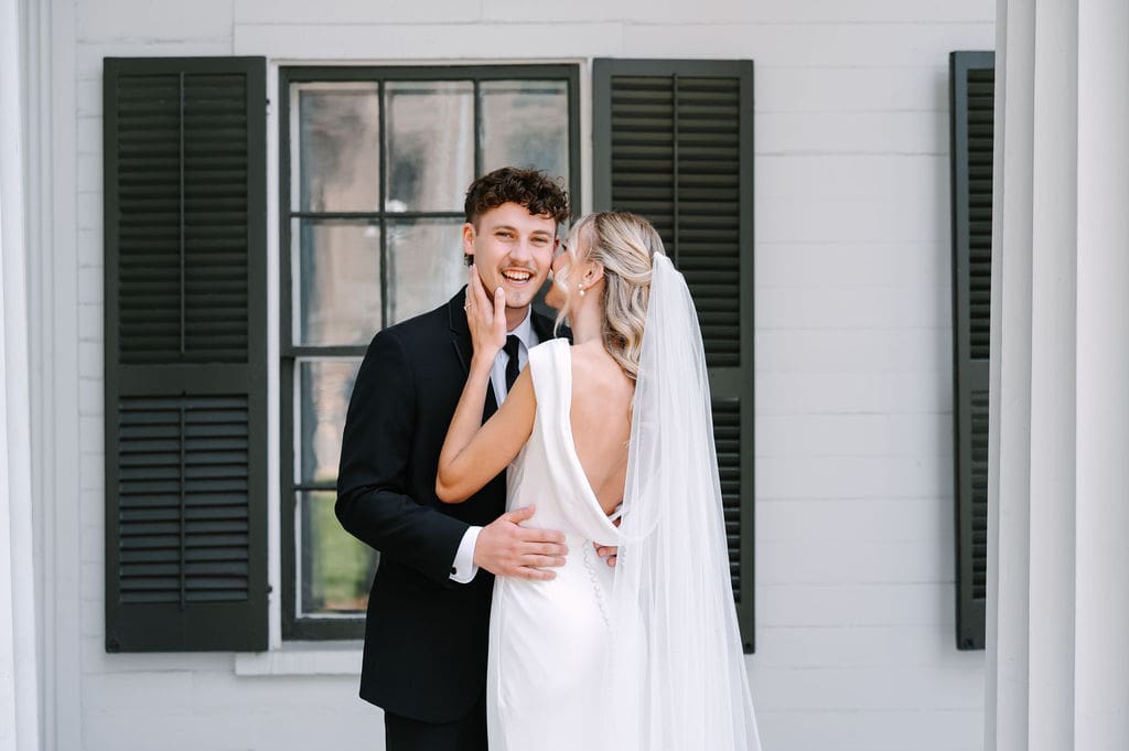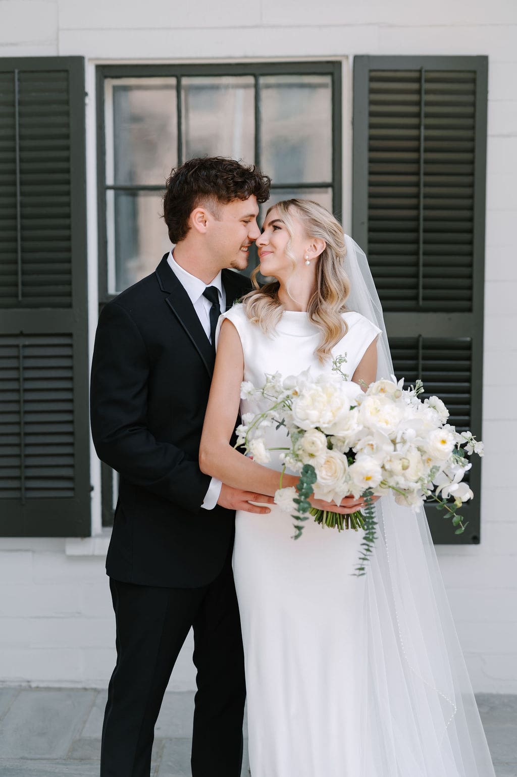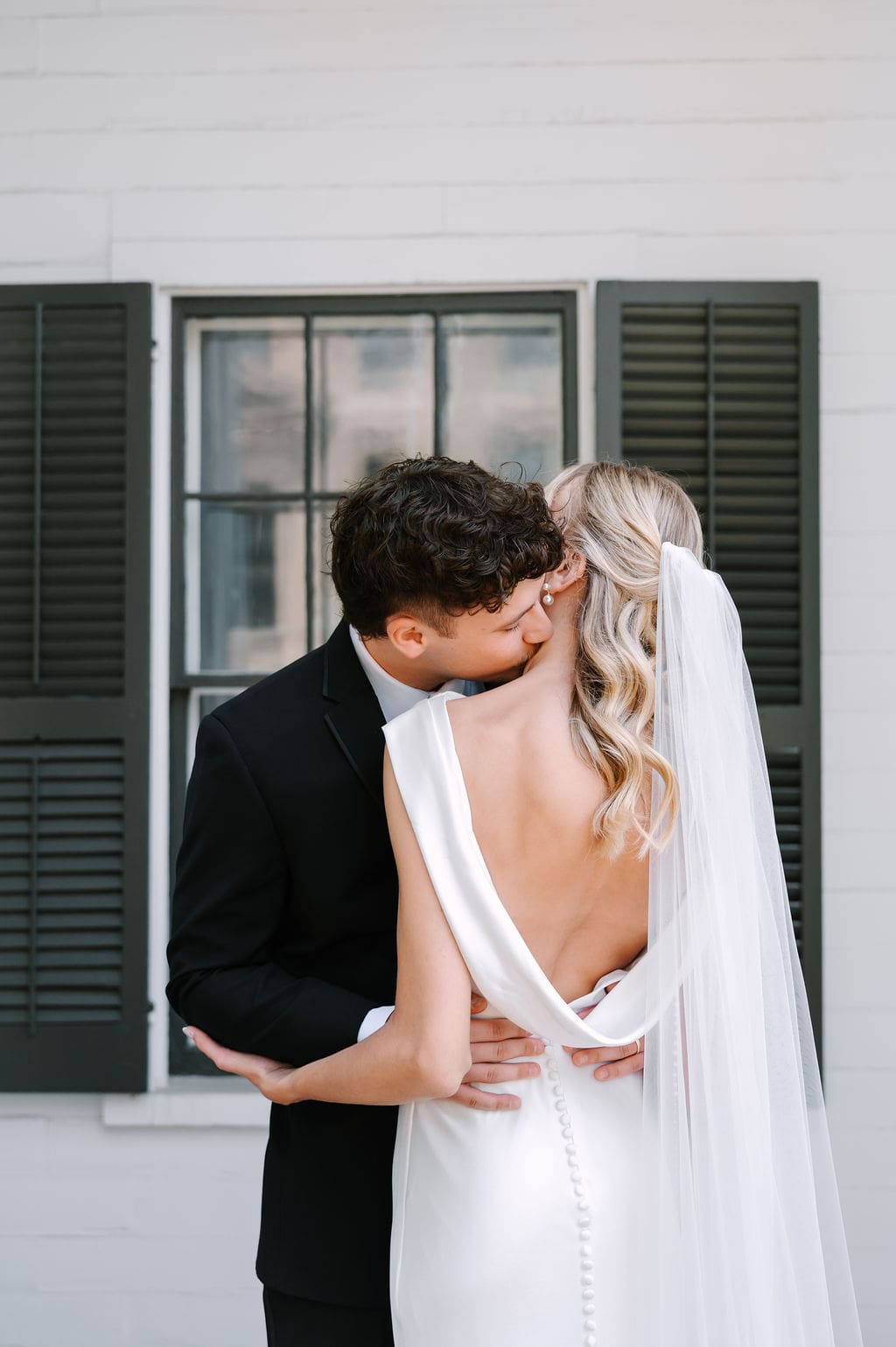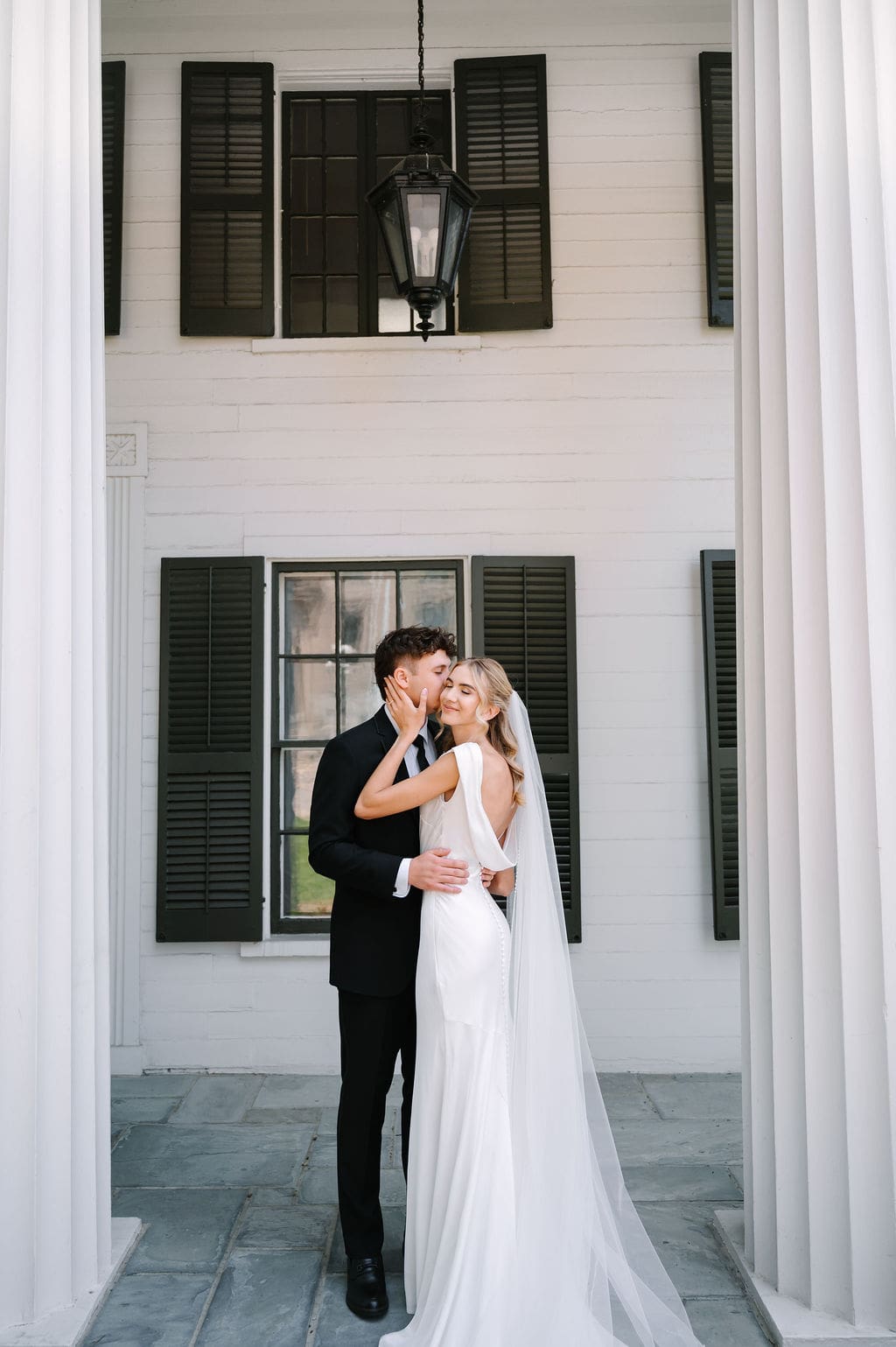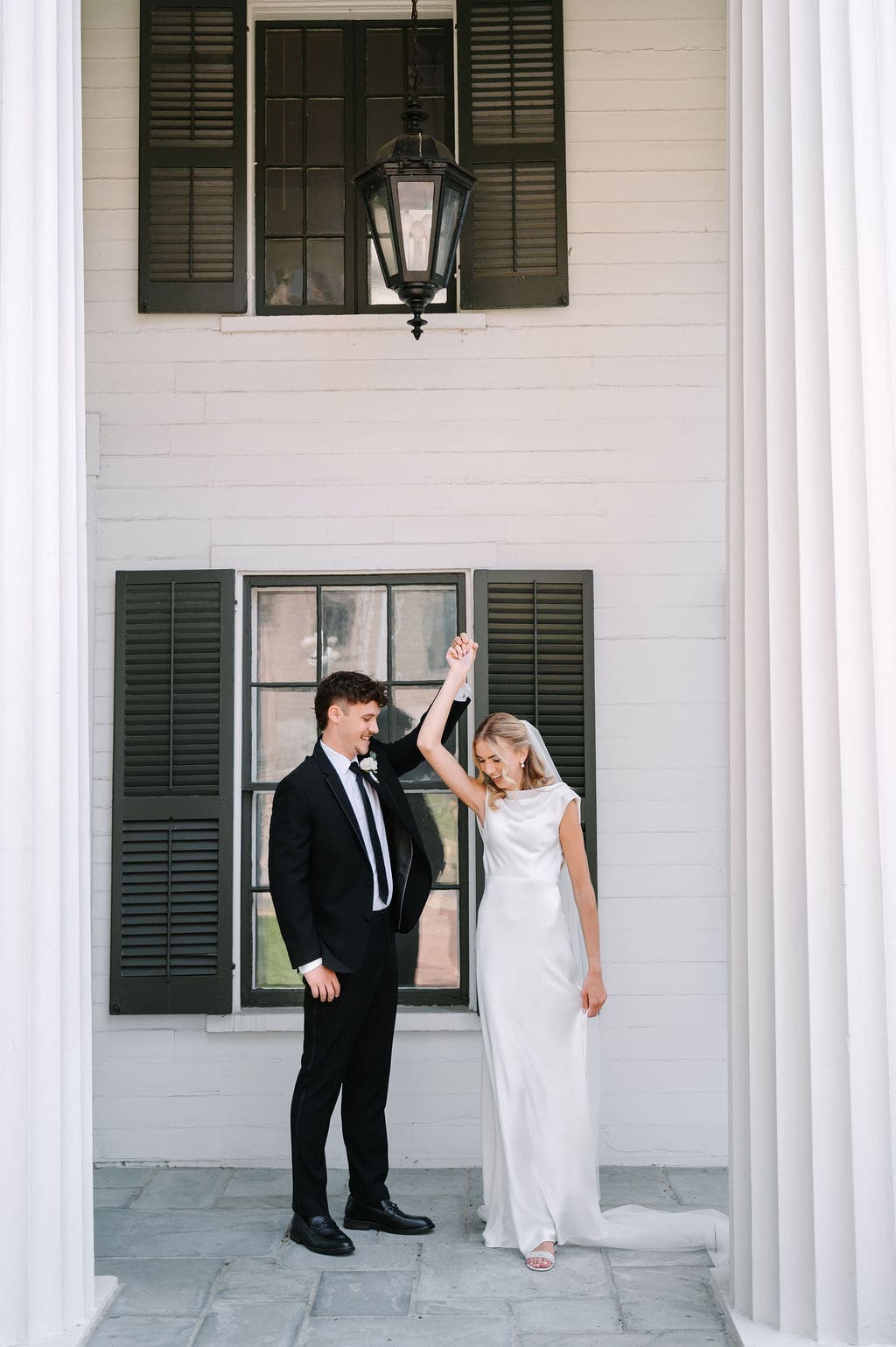 When an unexpected event filled the city center with crowds, we pivoted from our original portrait location and found a stunning alternative just down the street from the church. This stately law firm with white columns and black windows fit perfectly with the couple’s vision and color palette.