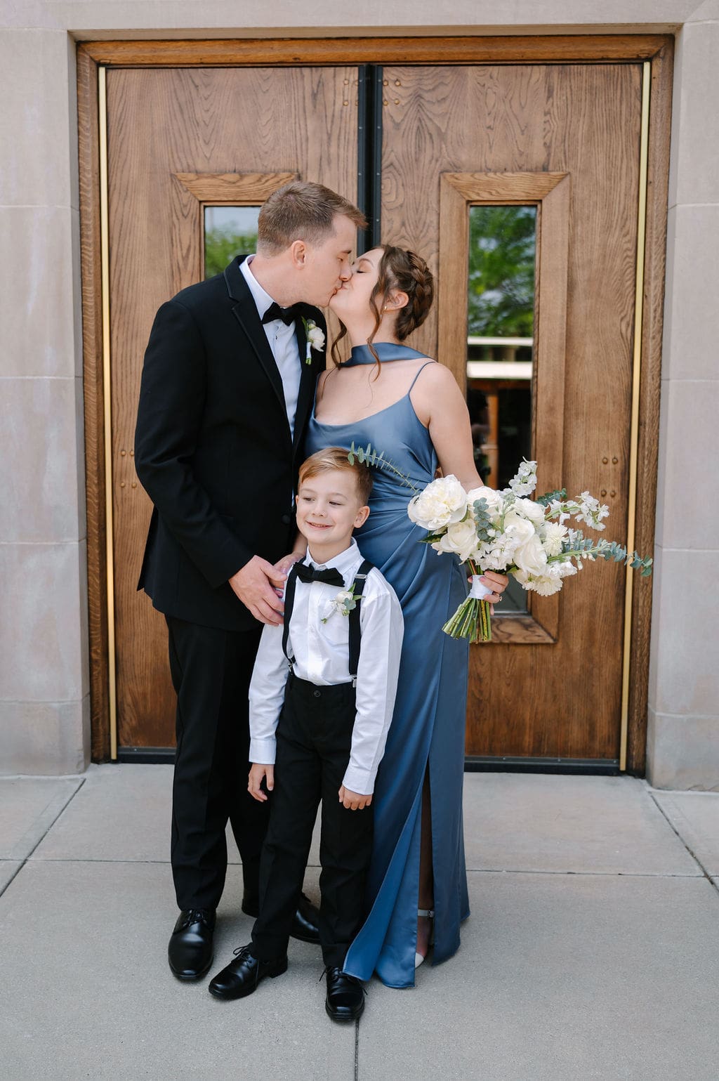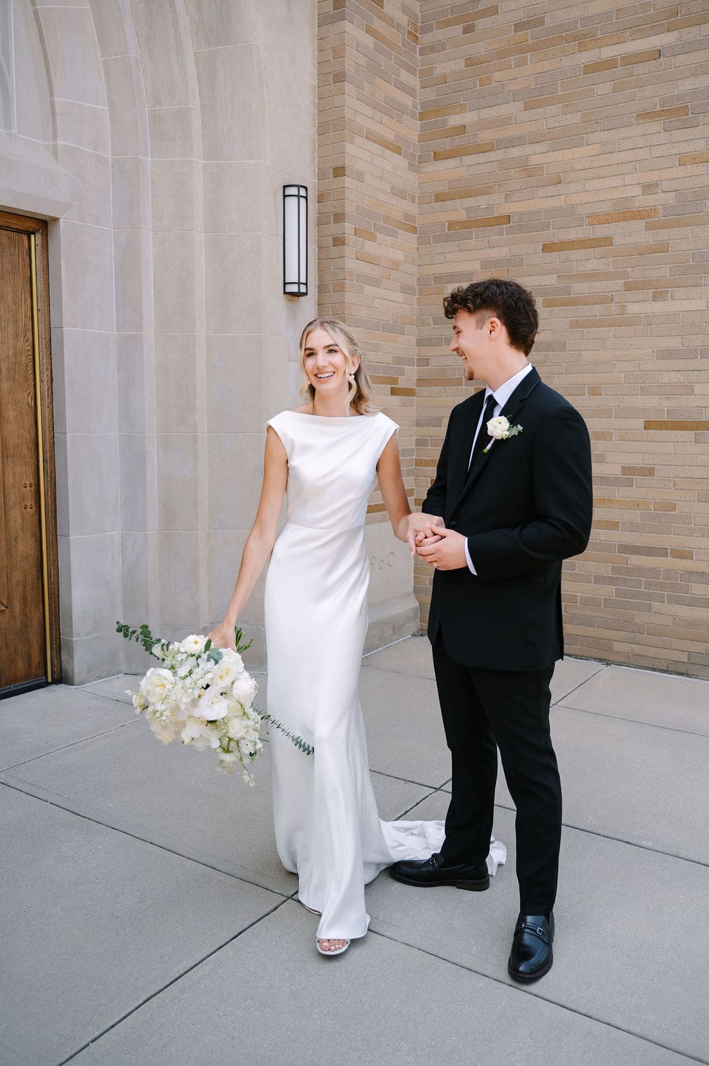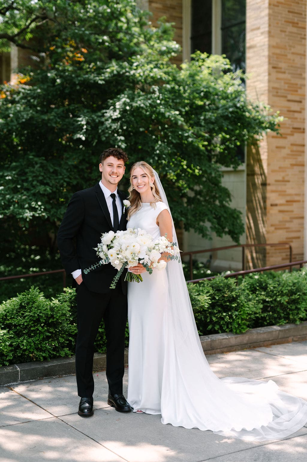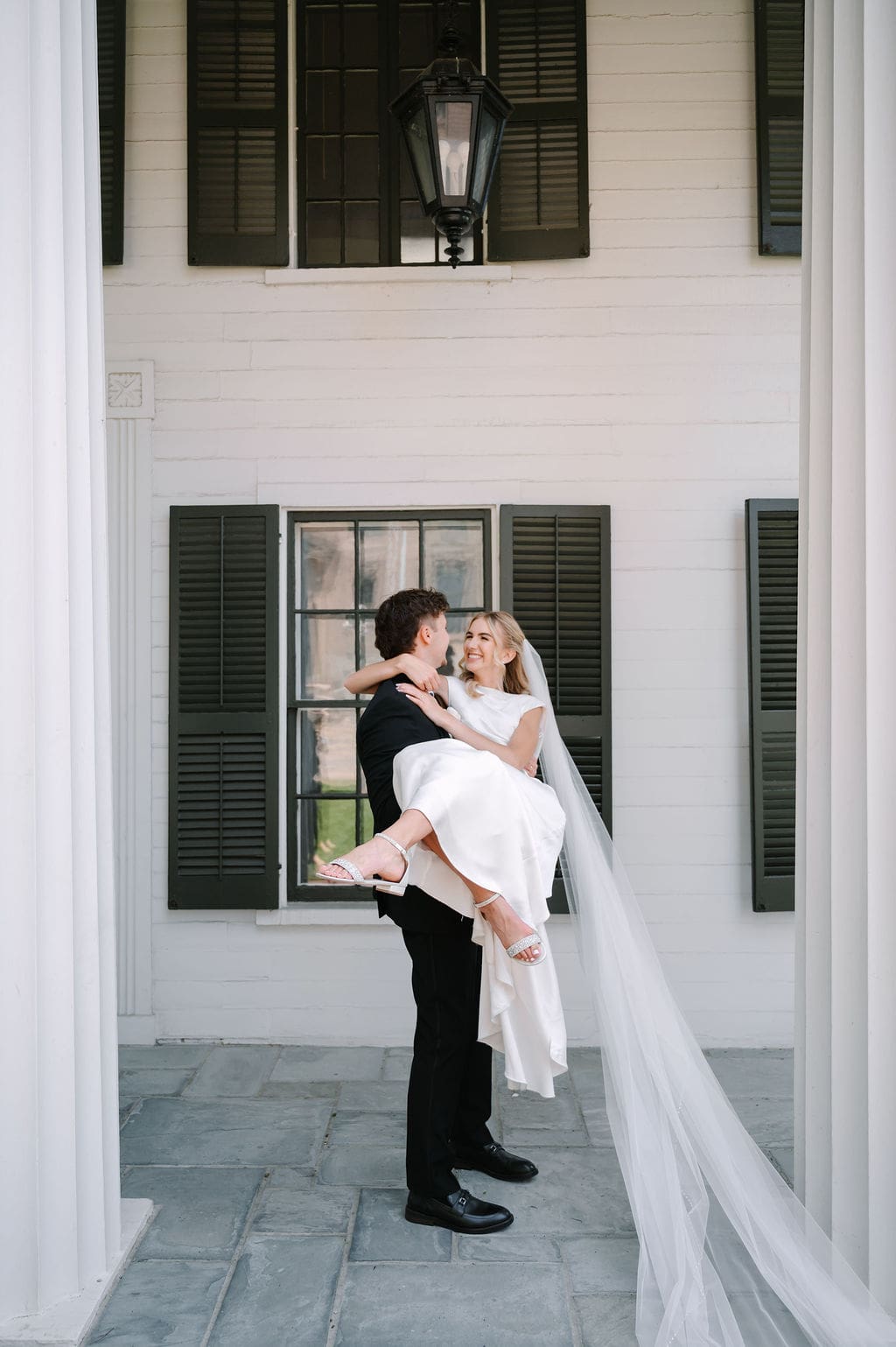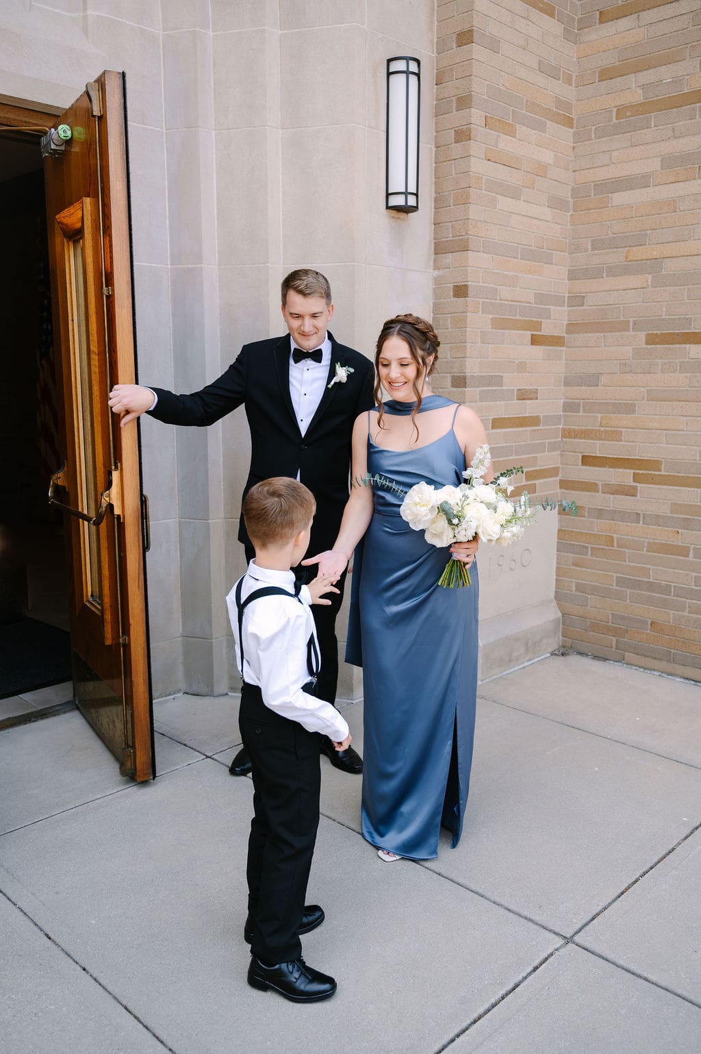 When an unexpected event filled the city center with crowds, we pivoted from our original portrait location and found a stunning alternative just down the street from the church. This stately law firm with white columns and black windows fit perfectly with the couple’s vision and color palette.