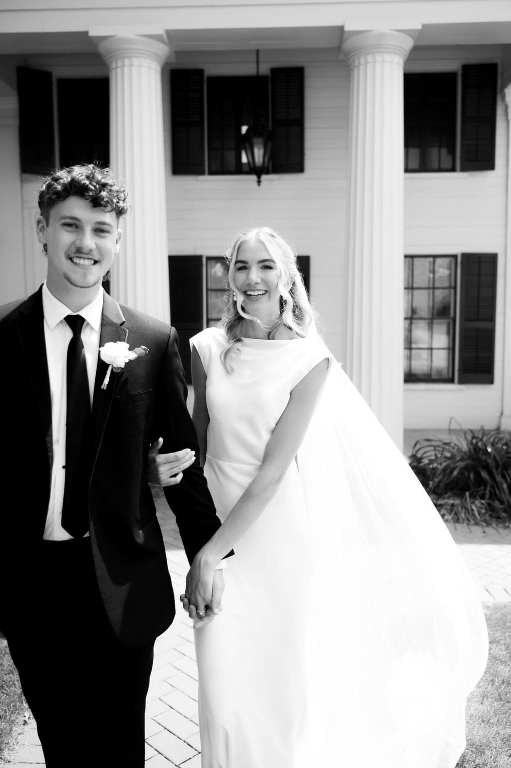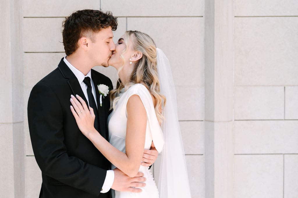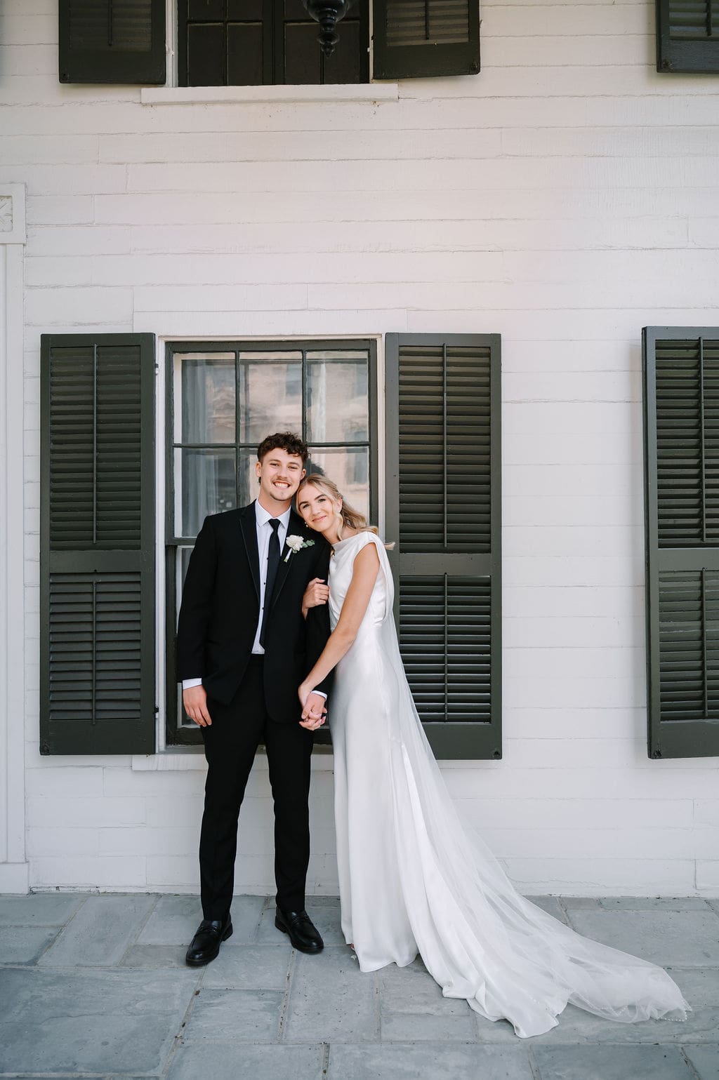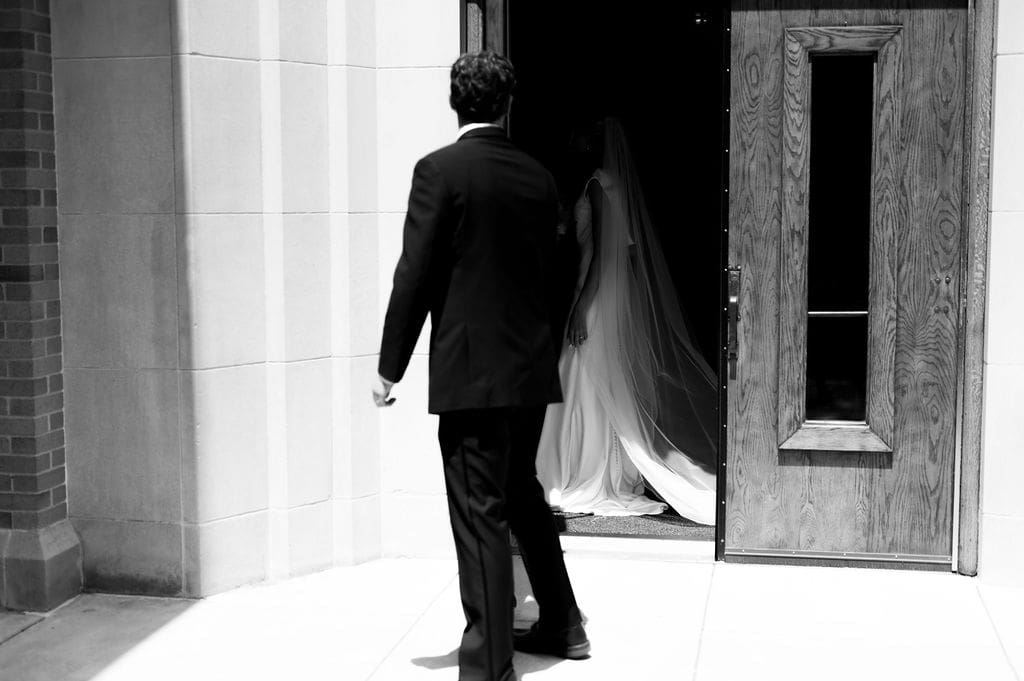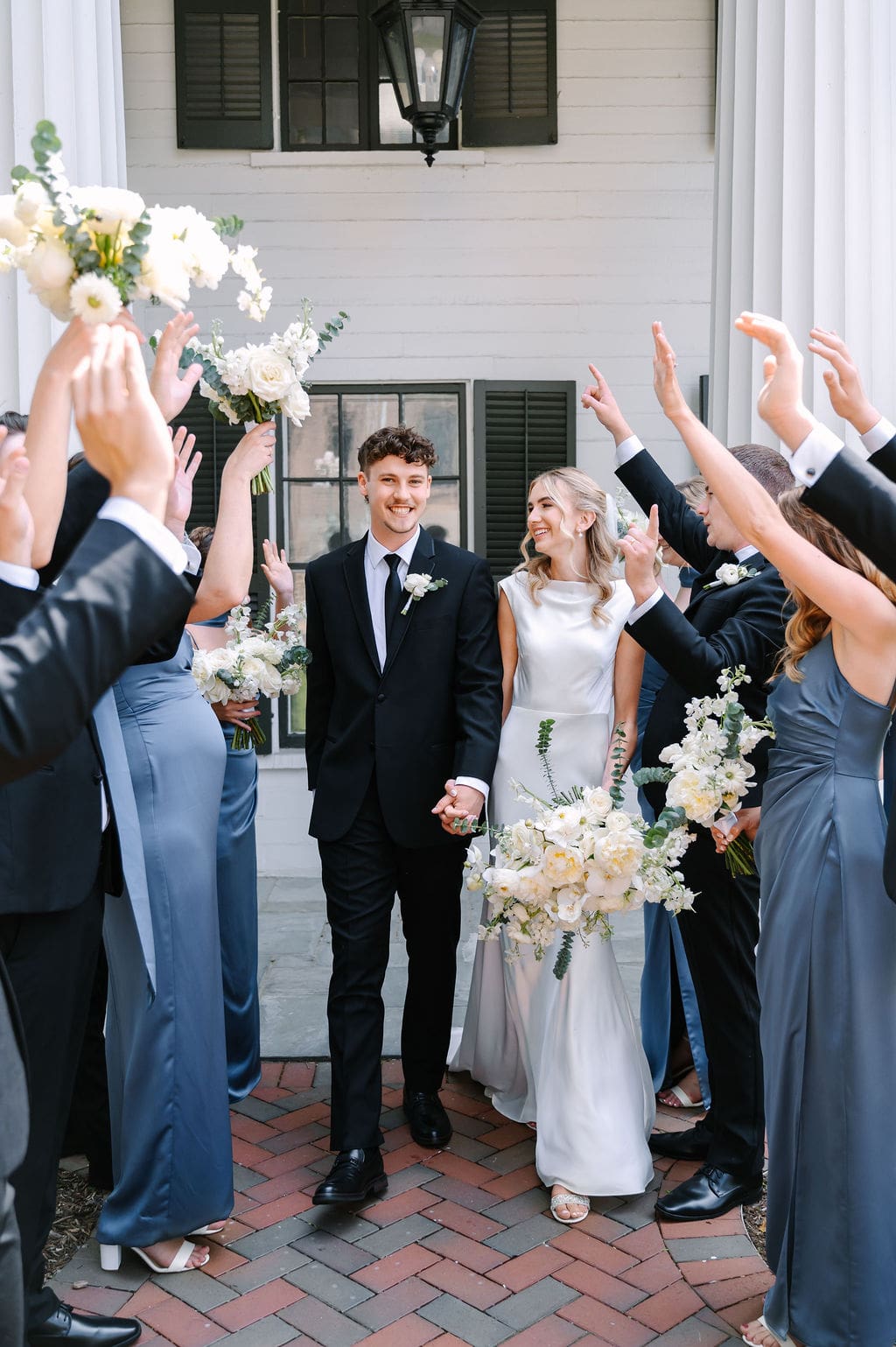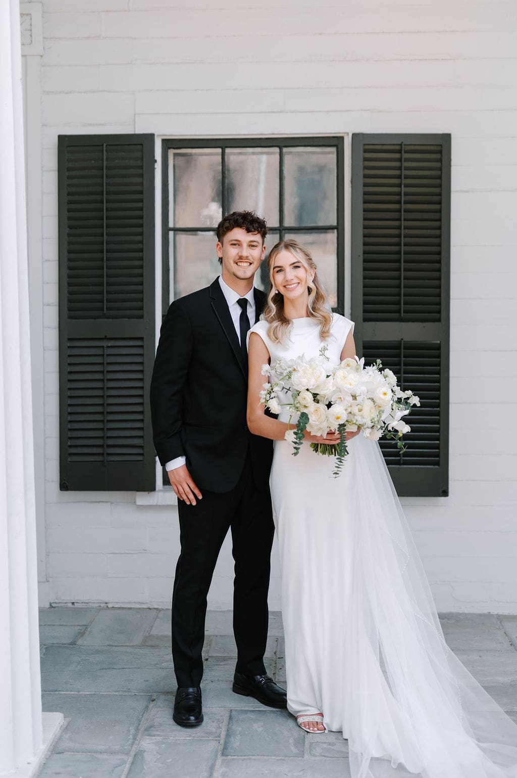 When an unexpected event filled the city center with crowds, we pivoted from our original portrait location and found a stunning alternative just down the street from the church. This stately law firm with white columns and black windows fit perfectly with the couple’s vision and color palette.