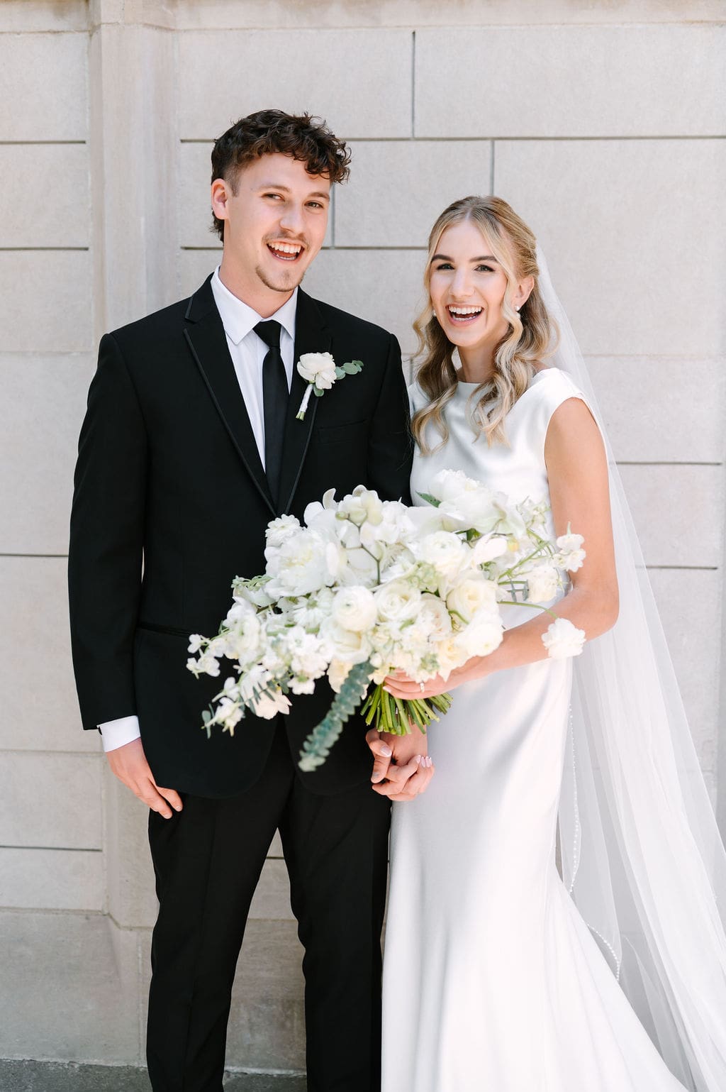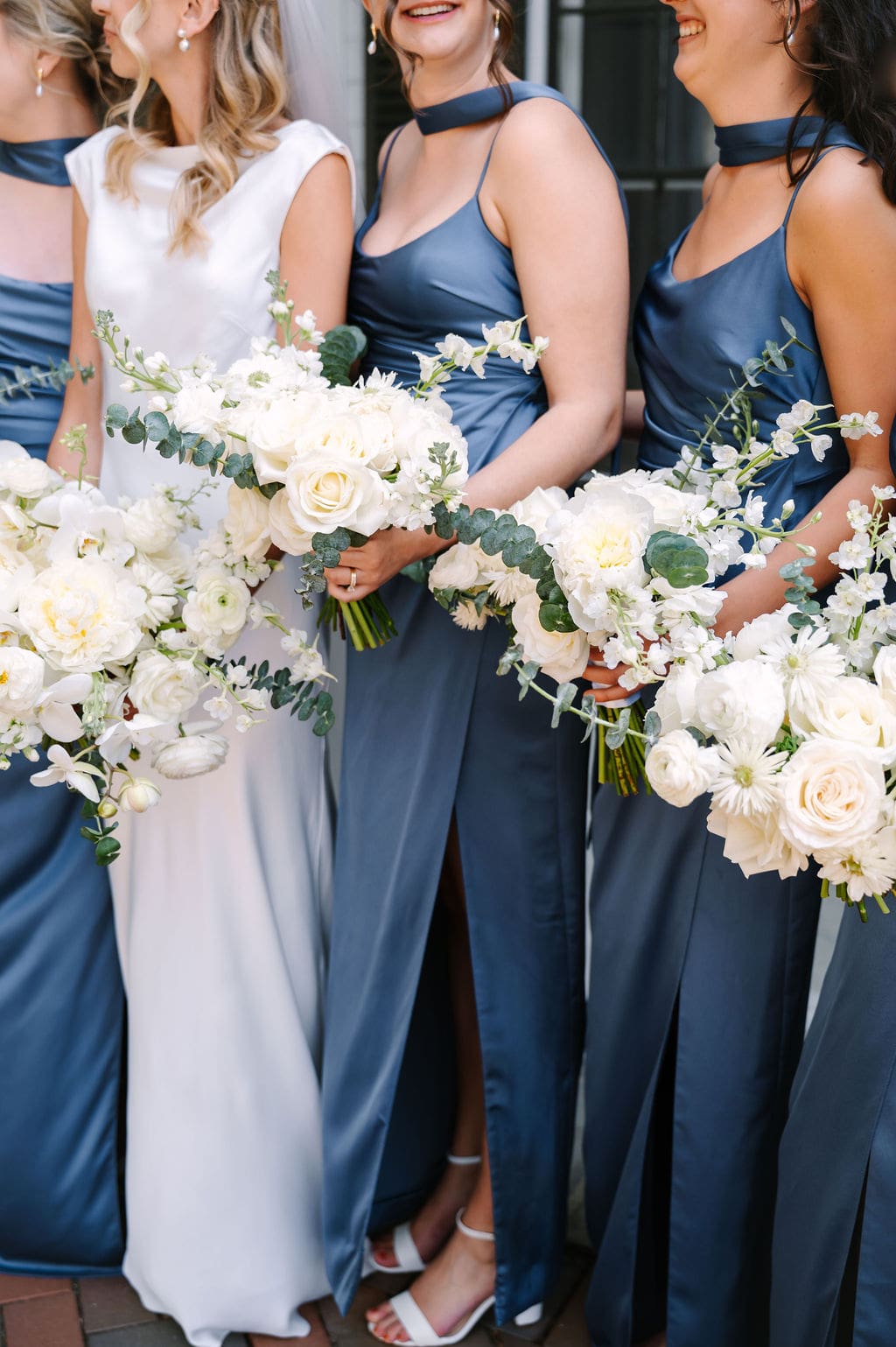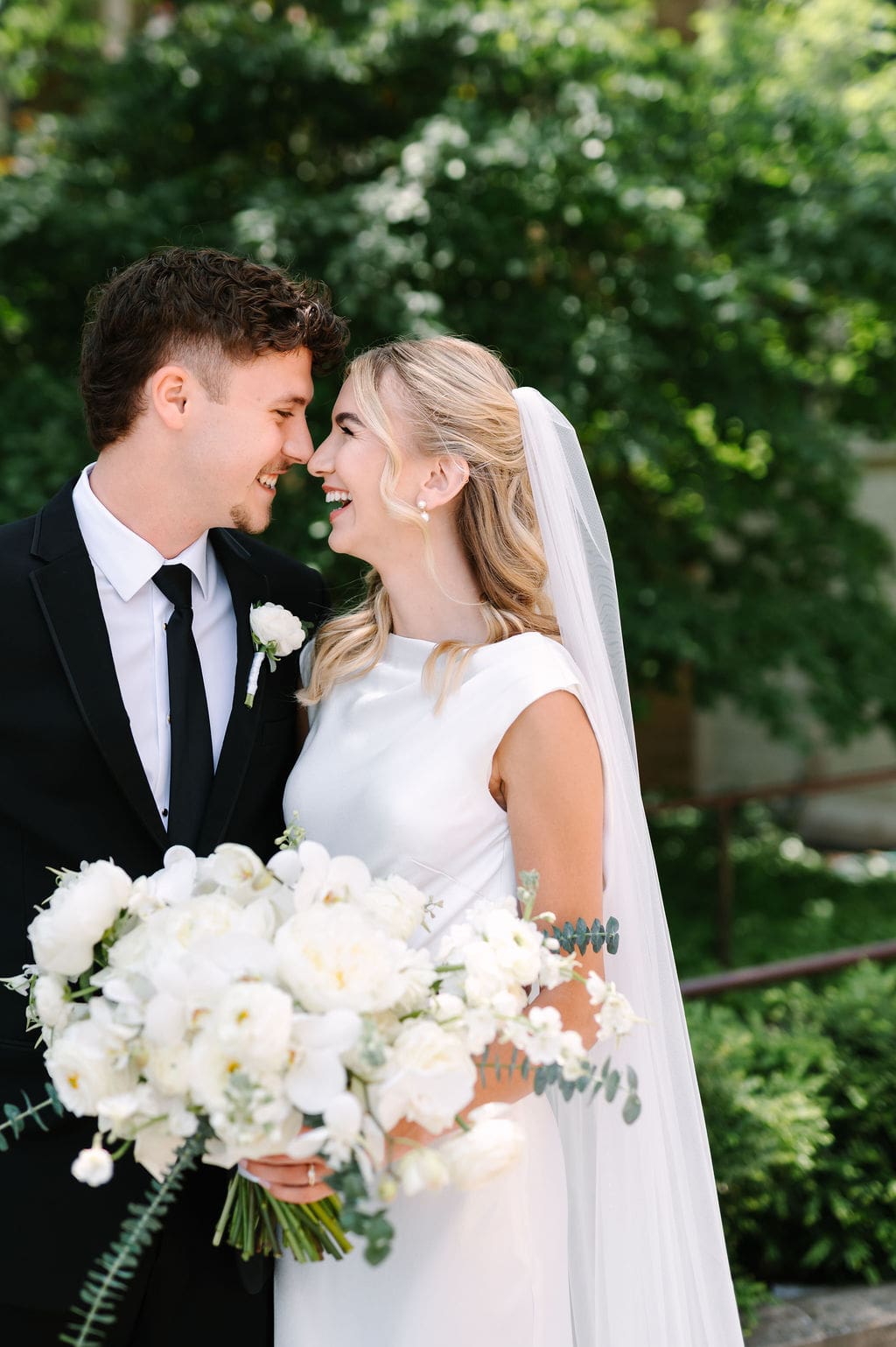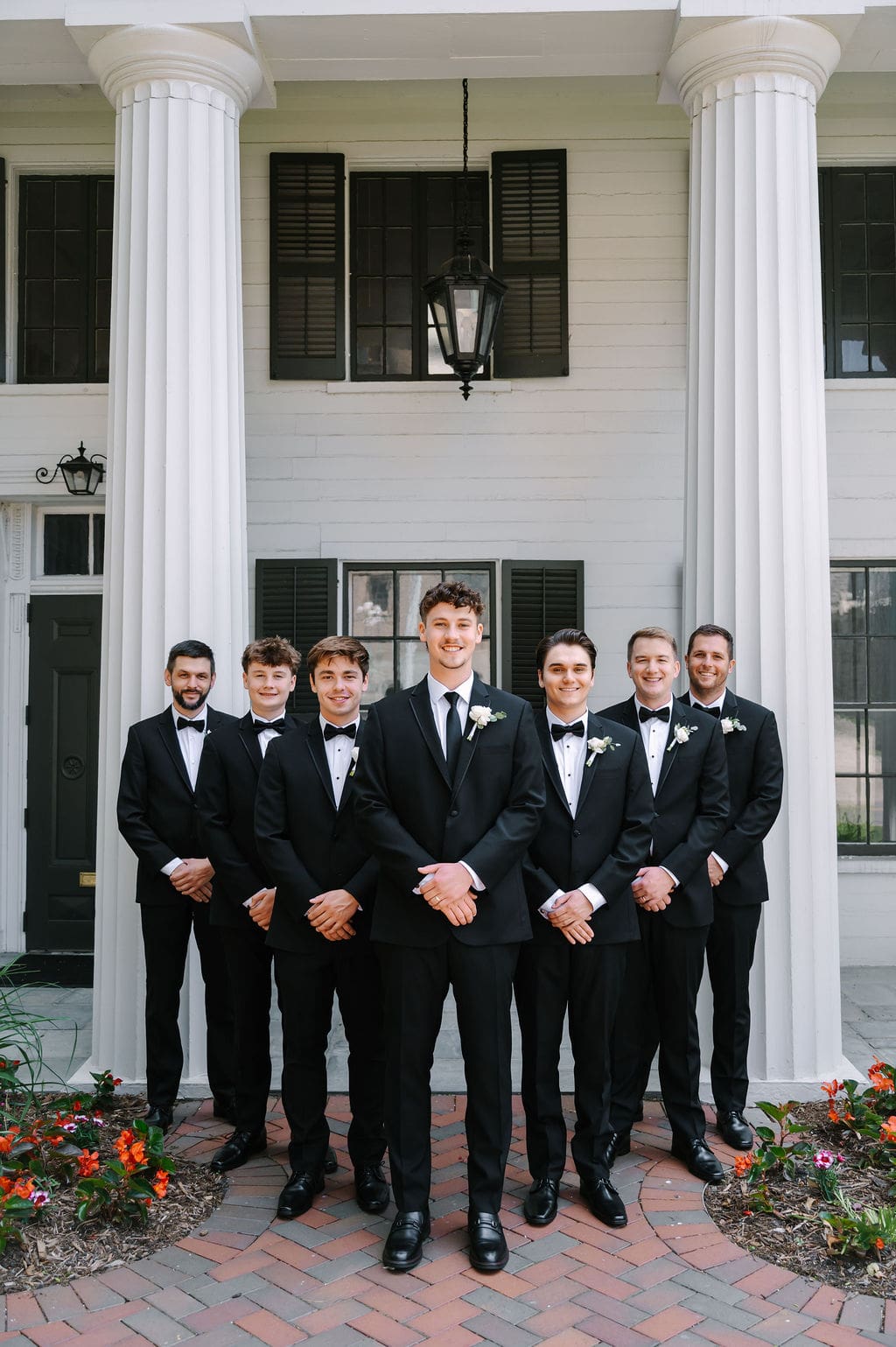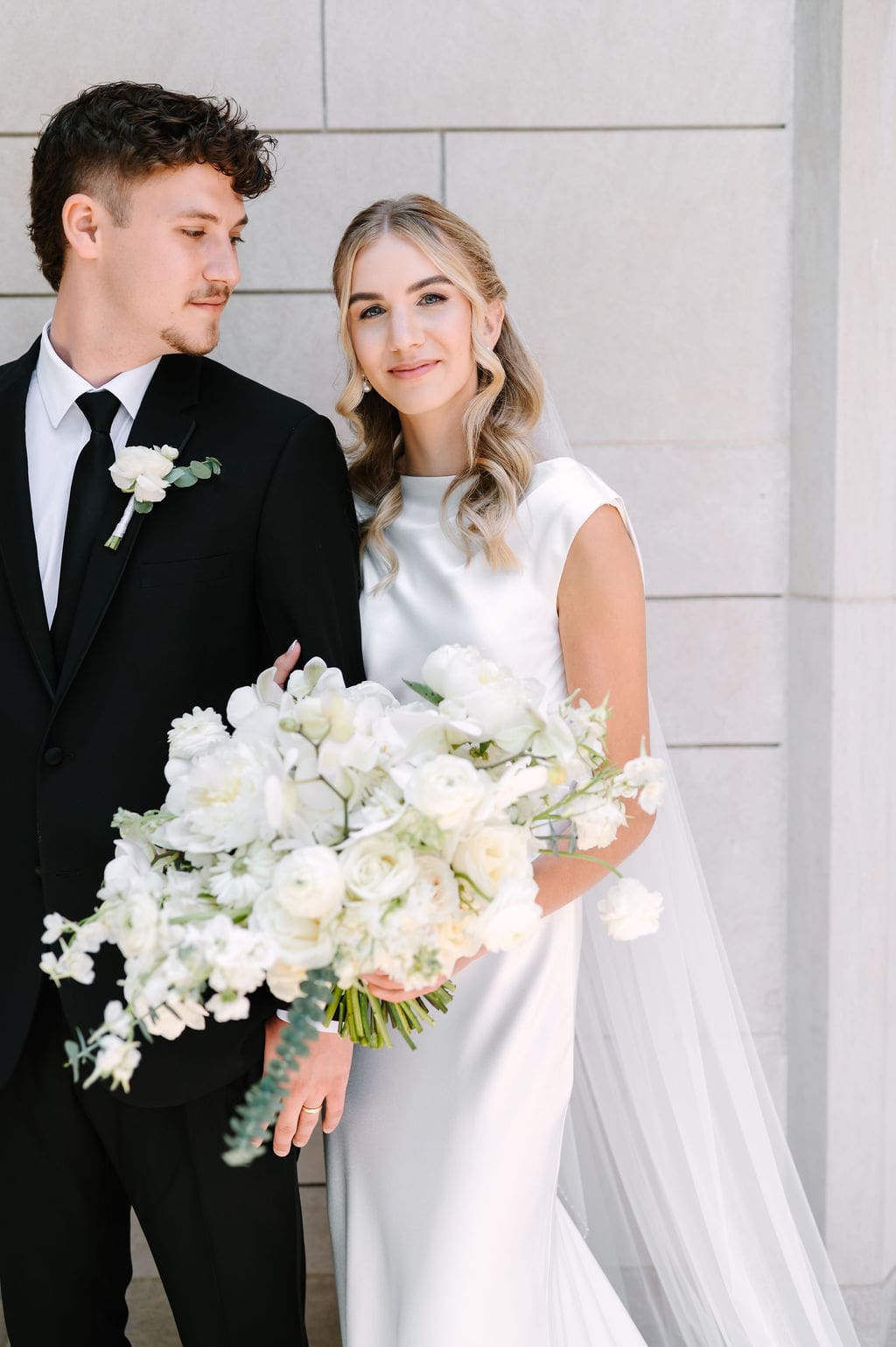 When an unexpected event filled the city center with crowds, we pivoted from our original portrait location and found a stunning alternative just down the street from the church. This stately law firm with white columns and black windows fit perfectly with the couple’s vision and color palette.