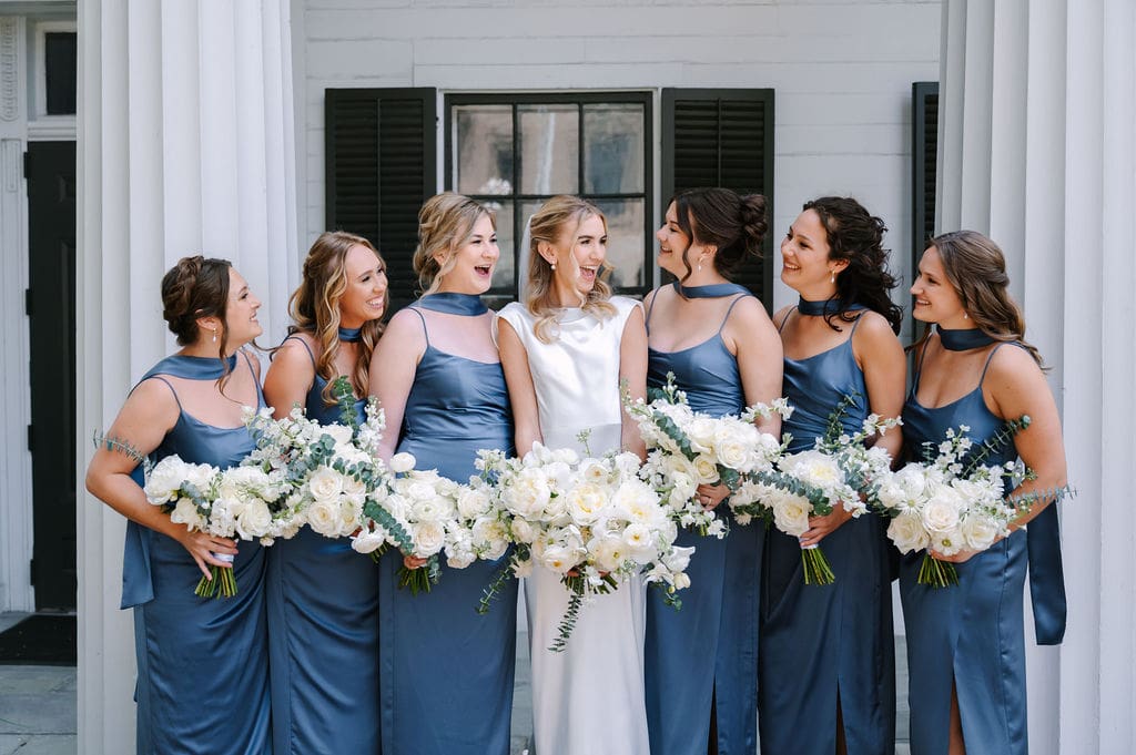 The bridesmaids wore evening-blue spaghetti strap dresses accented with neck scarves, while the groomsmen wore black suits from Jos. A. Bank, creating a clean, cohesive palette. Second Mile Video was there to capture every moment on film throughout the day.
