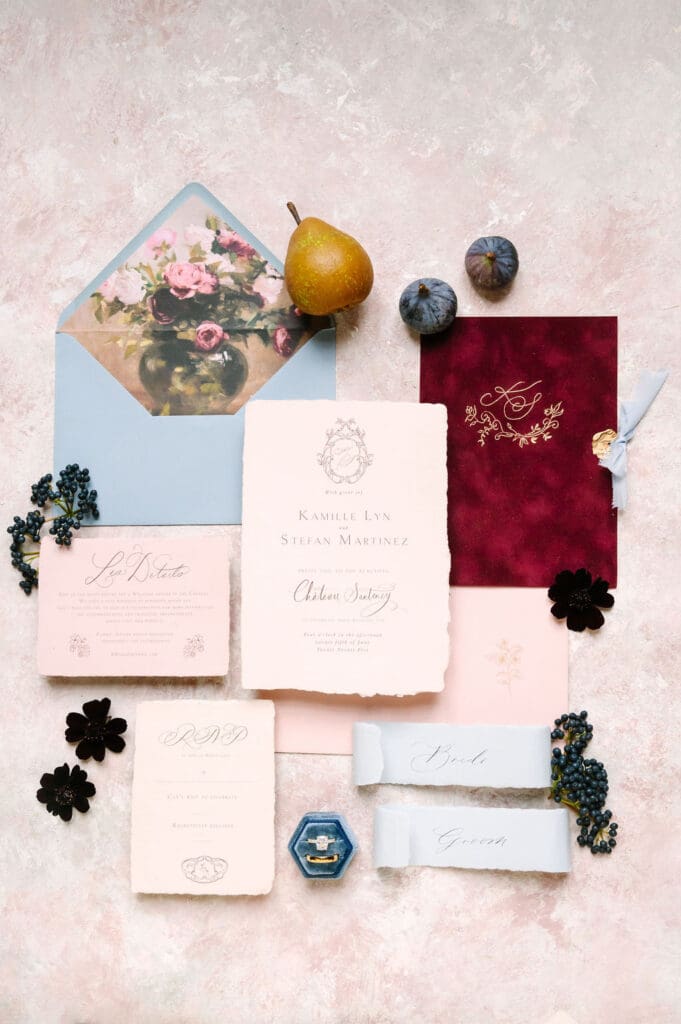 First and foremost, consider your color palette and theme. If you are using textured or patterned linens in other areas of your decor, consider requesting an extra to be used for flat lays. If your stationary design has a stunning pattern or design, consider printing a custom wallpaper or printed fabric. Other options include searching your venue for unique flooring, rugs, or paintings that can be used as a backdrop.
