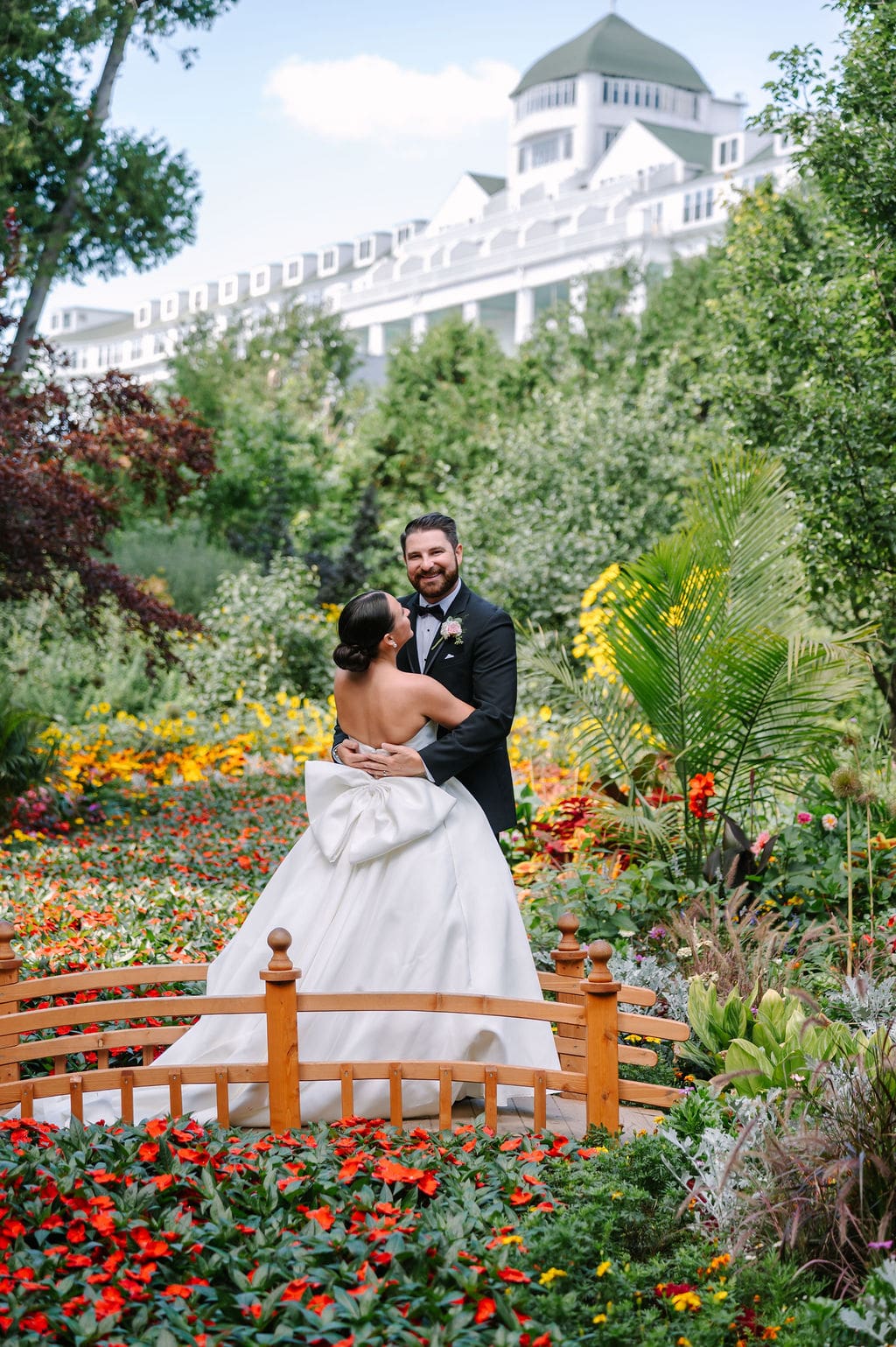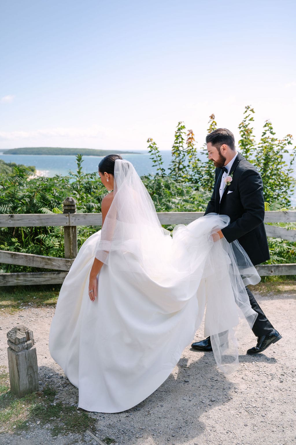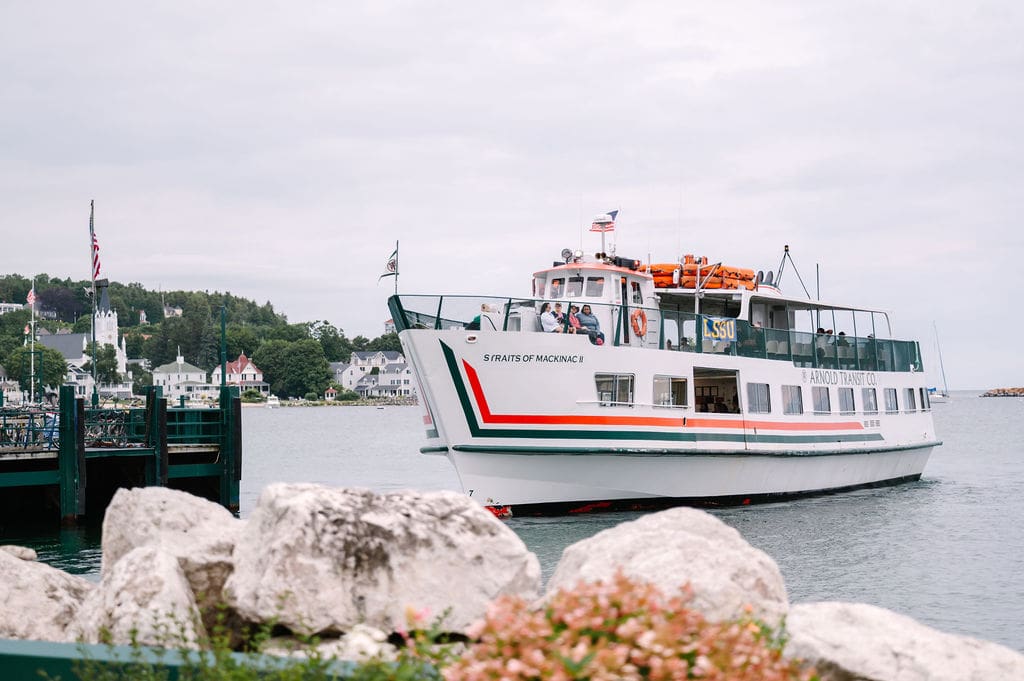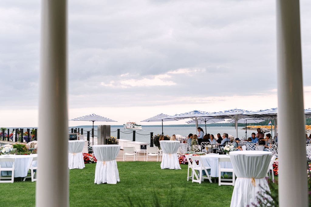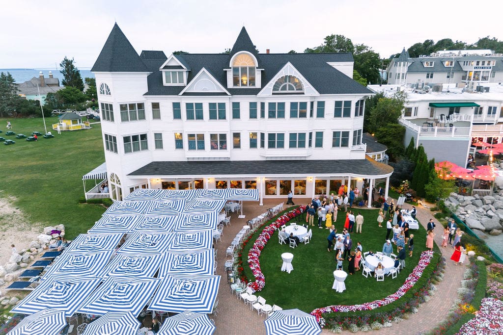 The celebration began with guests taking the ferry from the mainland to Mackinac Island, where they attended a welcome party at the Iroquois Hotel. Surrounded by Victorian architecture and lake breezes, anticipation built as the wedding day approached.