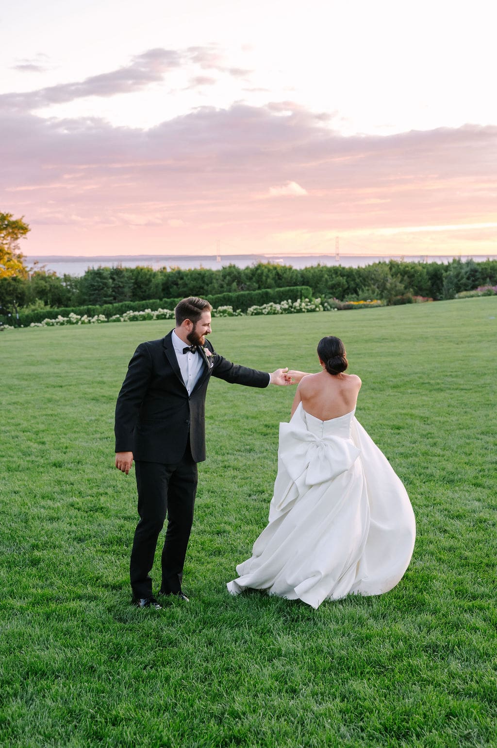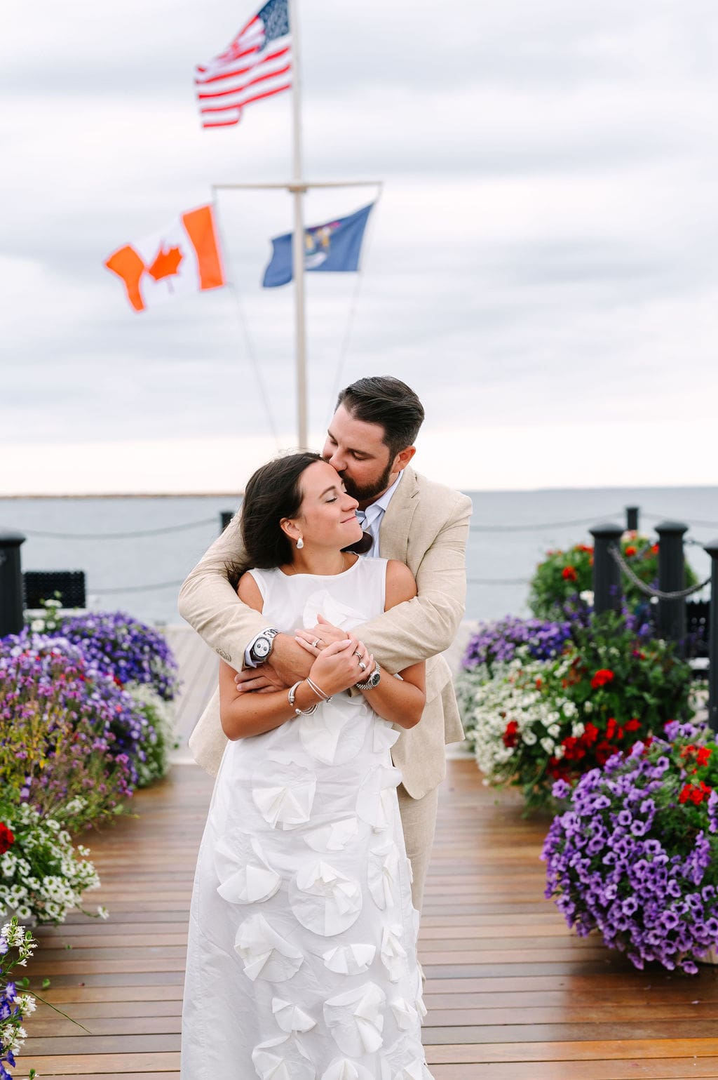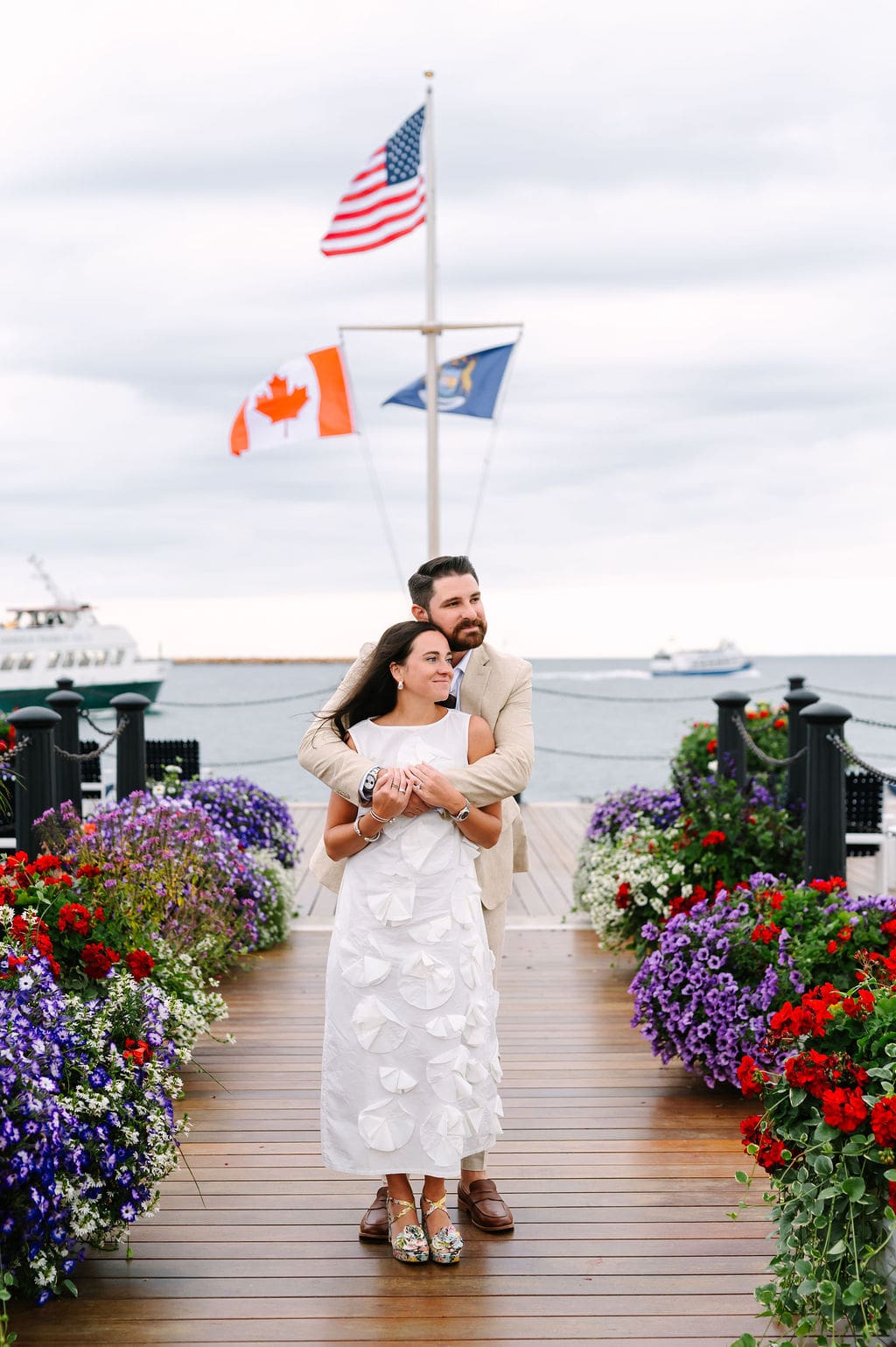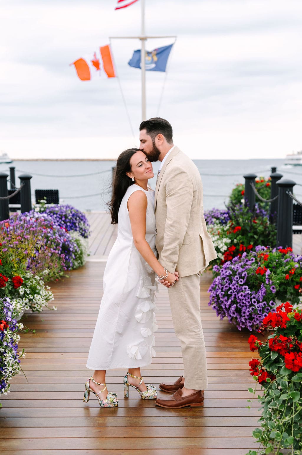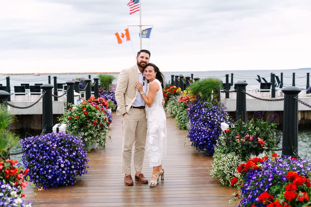 Following a private first look in the orchard at The Inn at Stonecliffe, Quincey and Chandler embarked on a two-hour Vis-à-Vis carriage ride around Mackinac Island. Their portraits spanned some of the island’s most iconic locations, including a lighthouse overlook, The Grand Hotel’s secret gardens, a downtown storefront overflowing with hydrangeas, and the docks of the Mackinac Island Yacht Club.