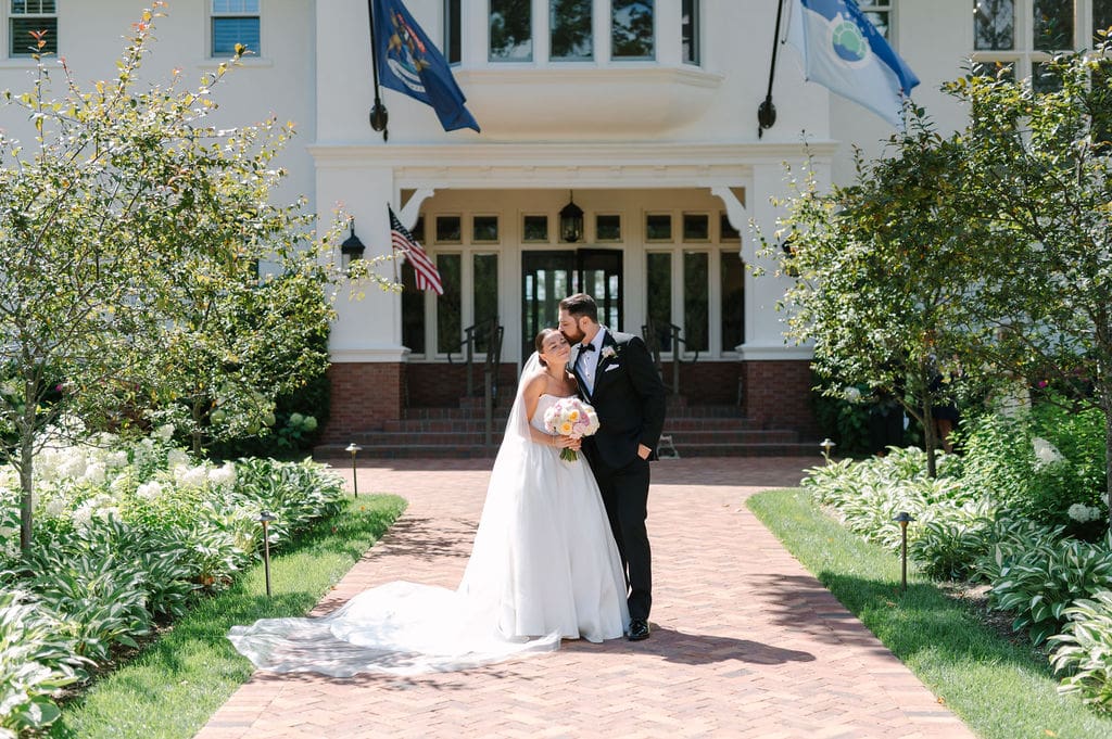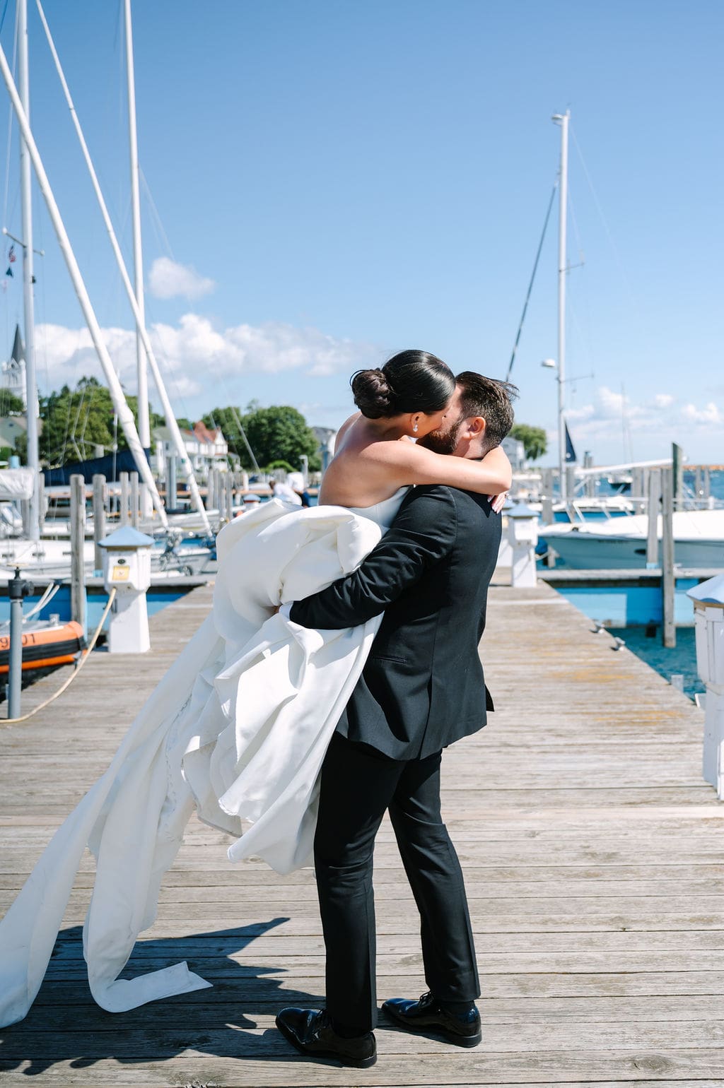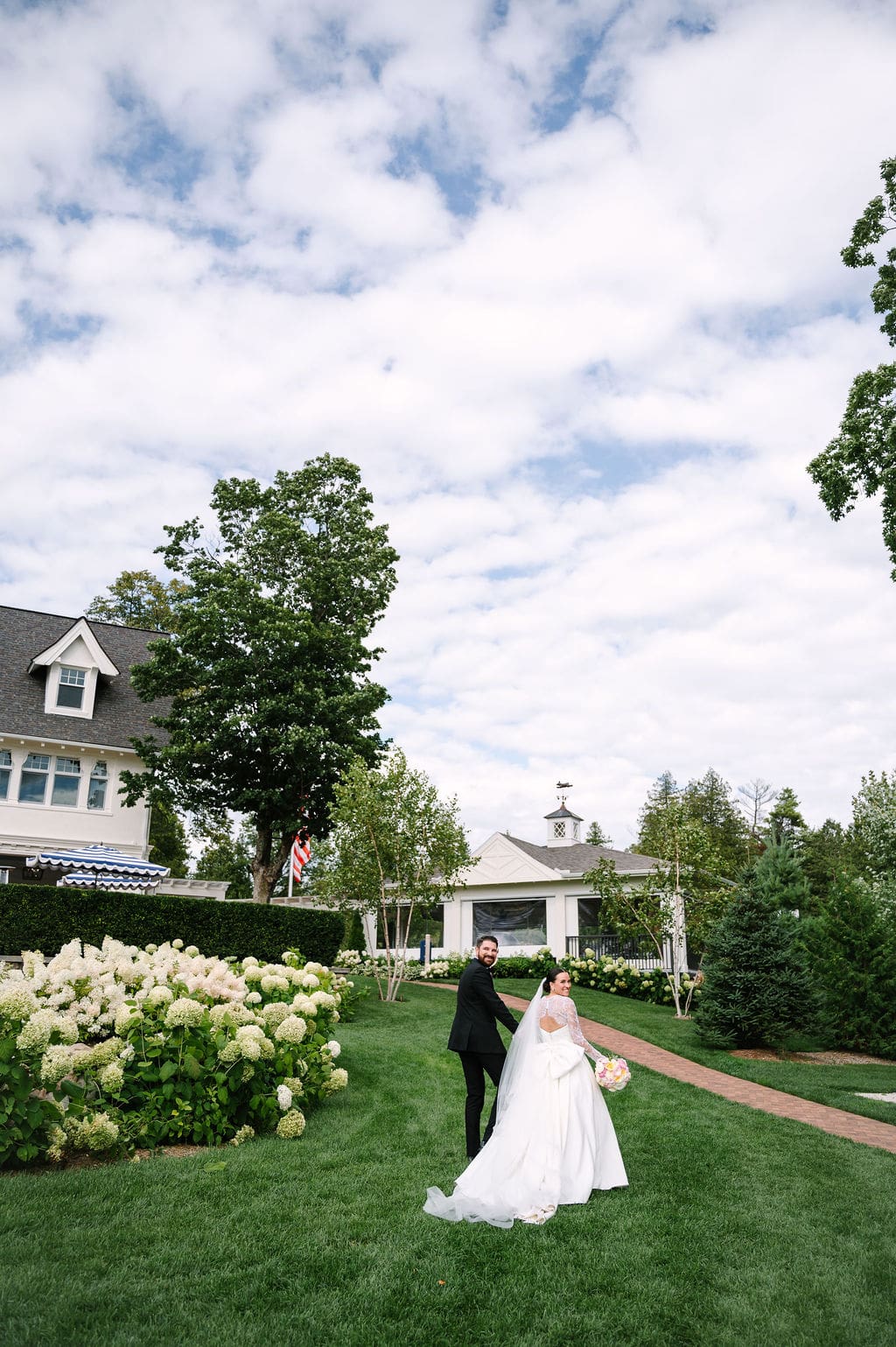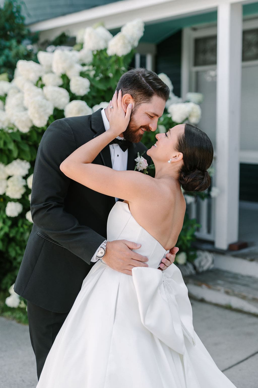 Following a private first look in the orchard at The Inn at Stonecliffe, Quincey and Chandler embarked on a two-hour Vis-à-Vis carriage ride around Mackinac Island. Their portraits spanned some of the island’s most iconic locations, including a lighthouse overlook, The Grand Hotel’s secret gardens, a downtown storefront overflowing with hydrangeas, and the docks of the Mackinac Island Yacht Club.