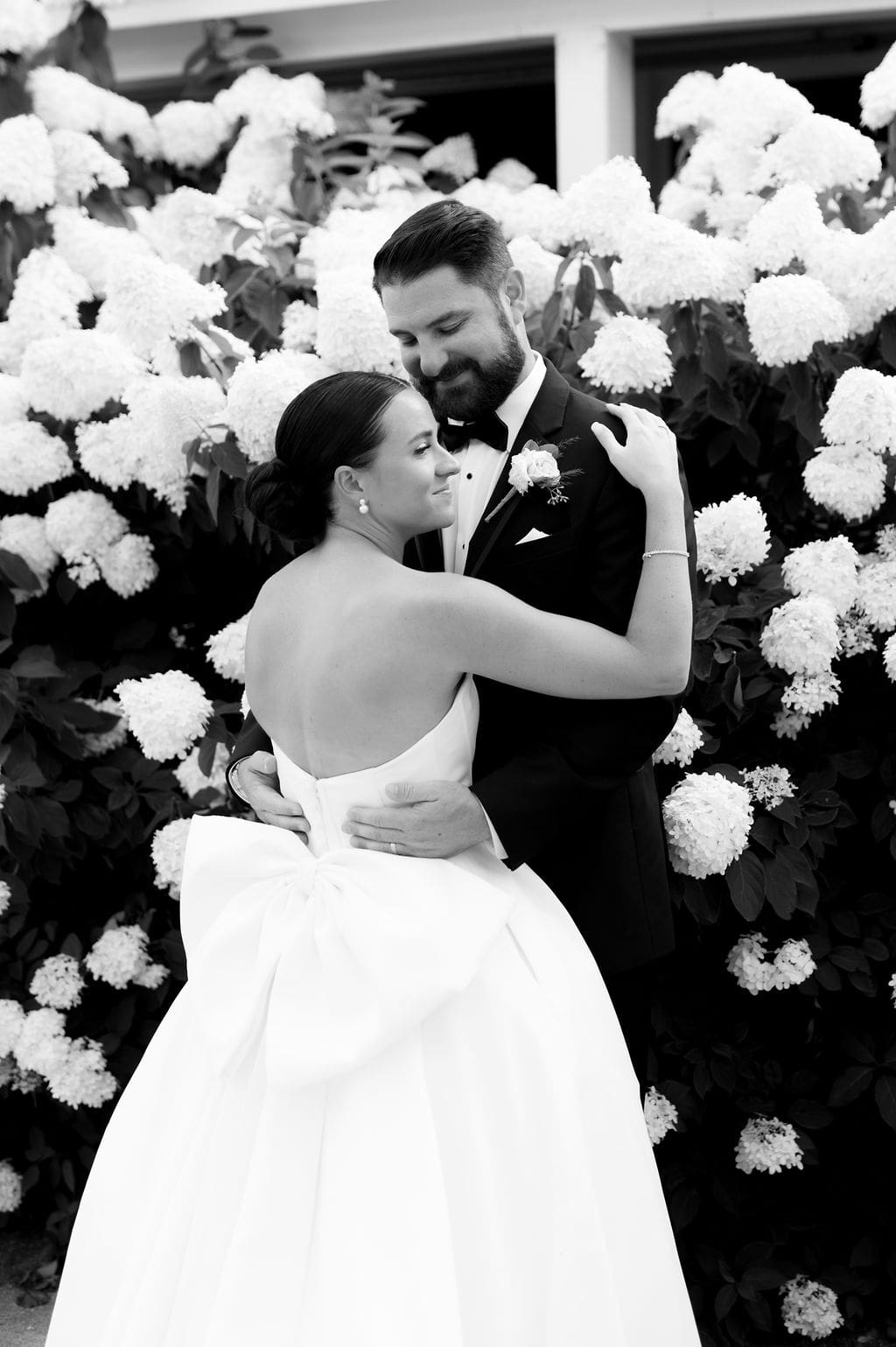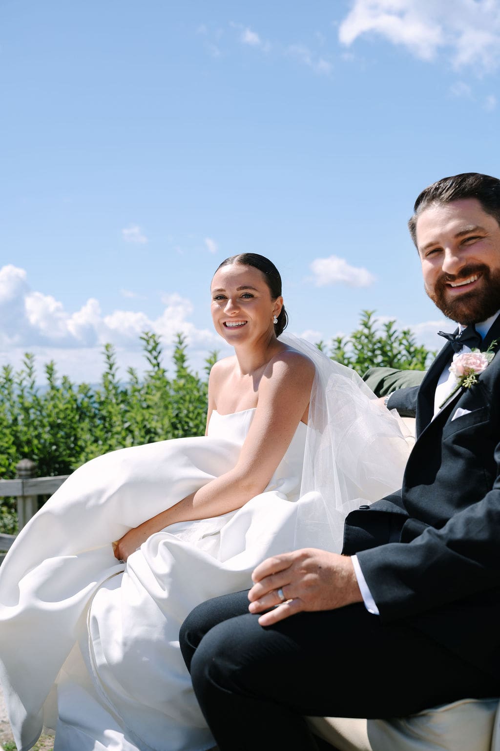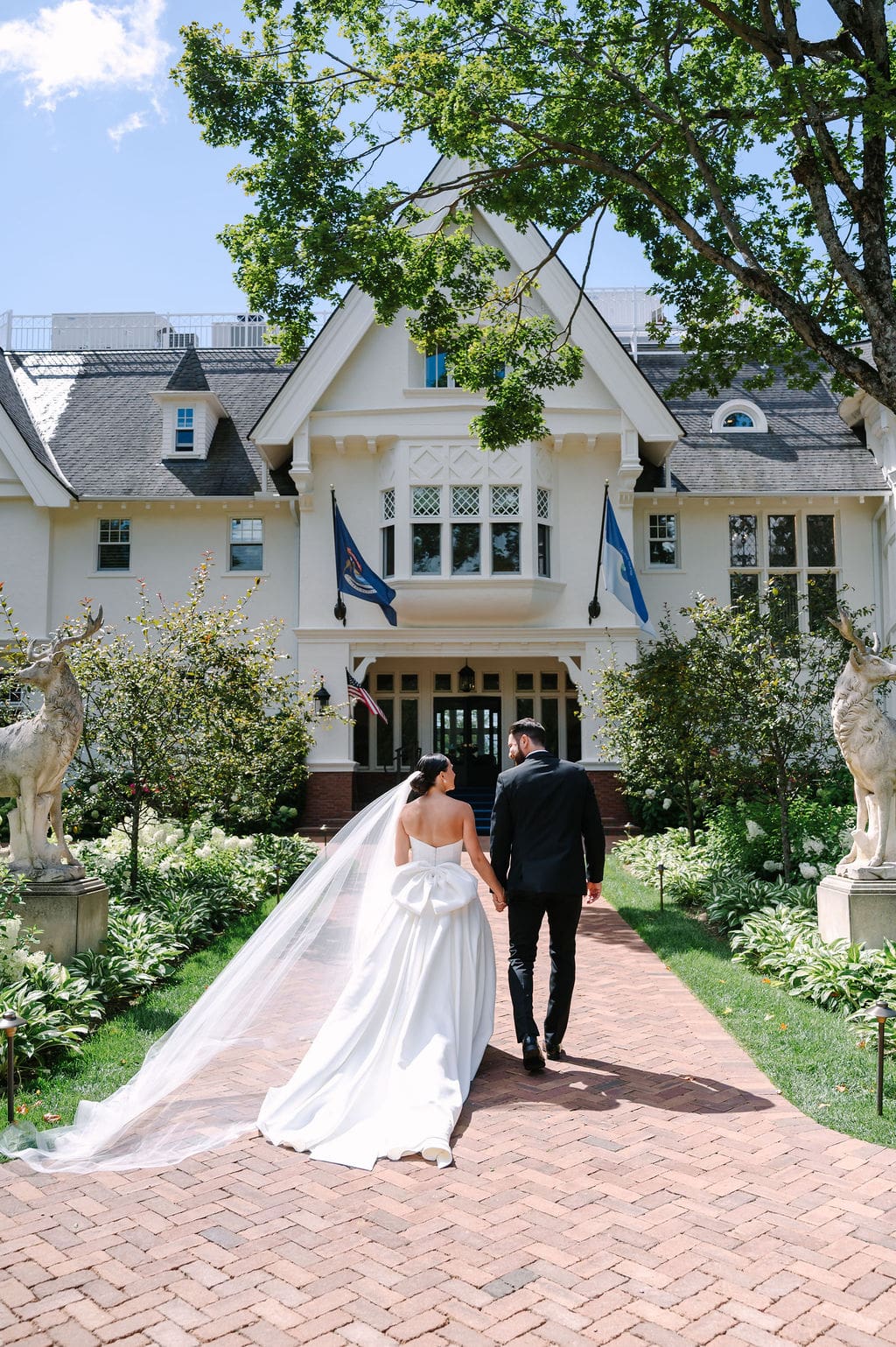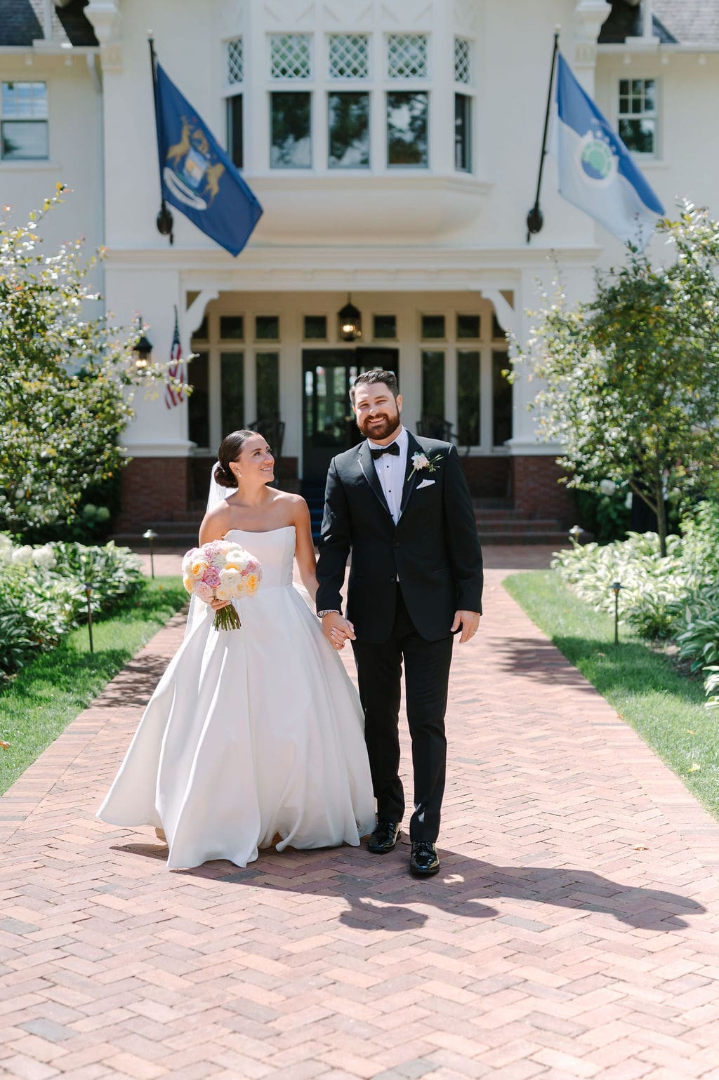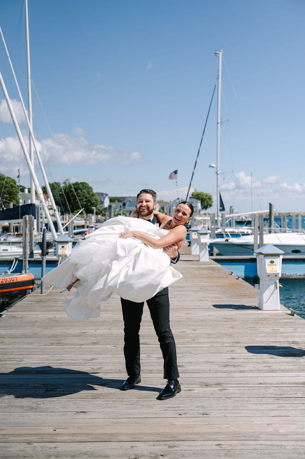 Following a private first look in the orchard at The Inn at Stonecliffe, Quincey and Chandler embarked on a two-hour Vis-à-Vis carriage ride around Mackinac Island. Their portraits spanned some of the island’s most iconic locations, including a lighthouse overlook, The Grand Hotel’s secret gardens, a downtown storefront overflowing with hydrangeas, and the docks of the Mackinac Island Yacht Club.