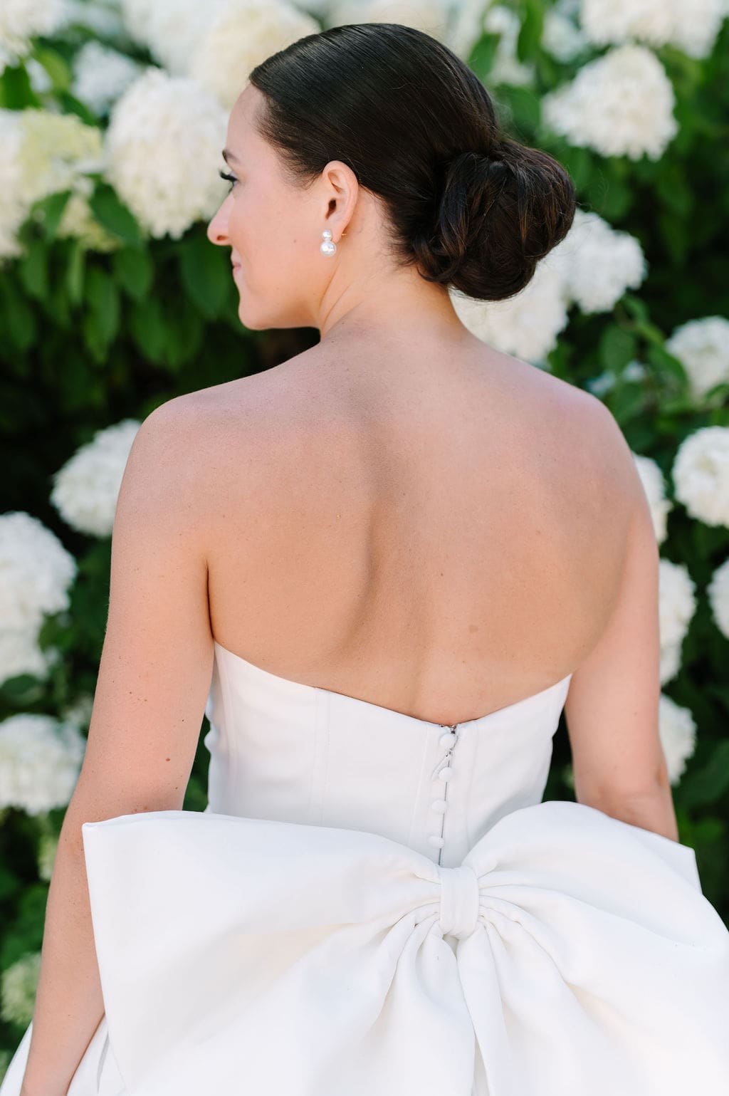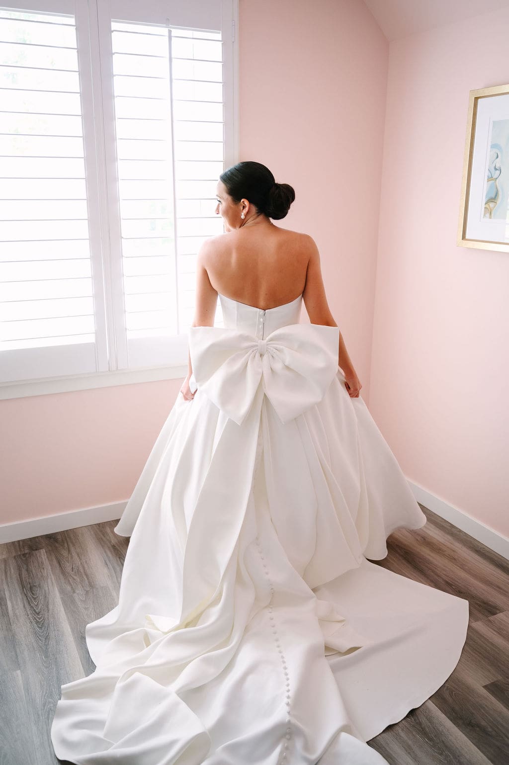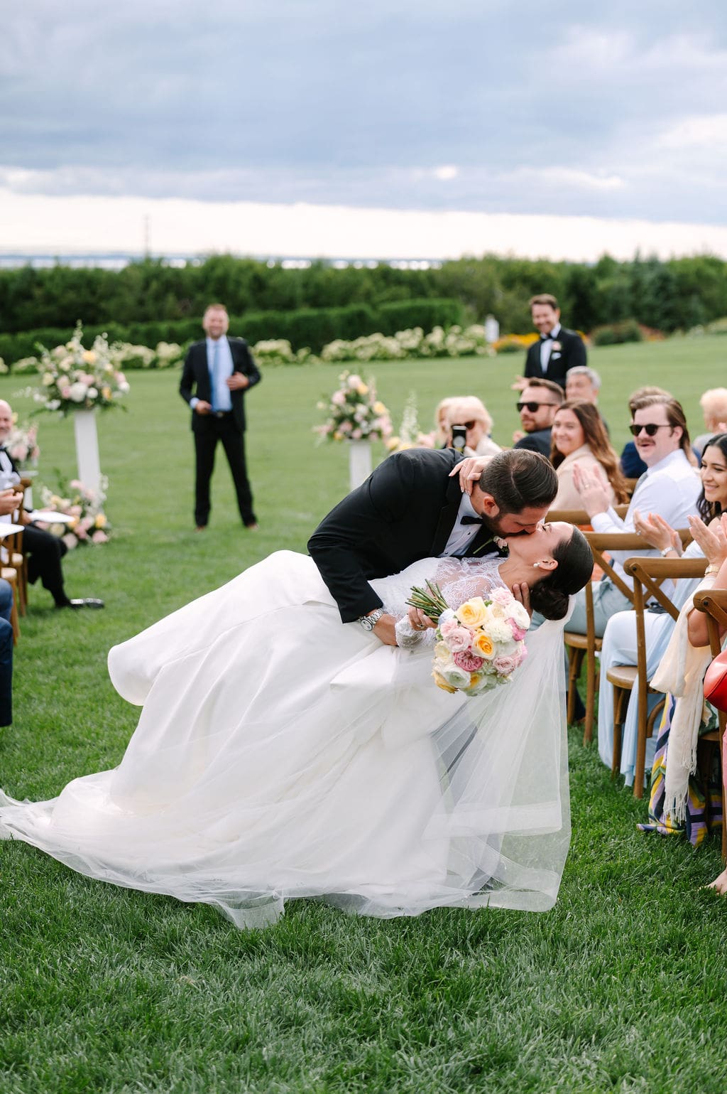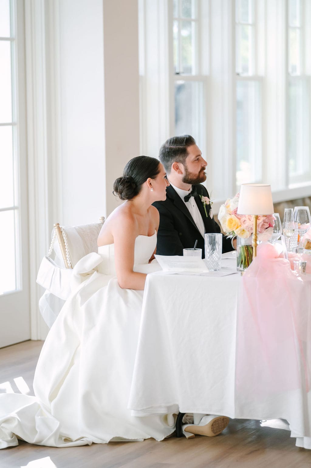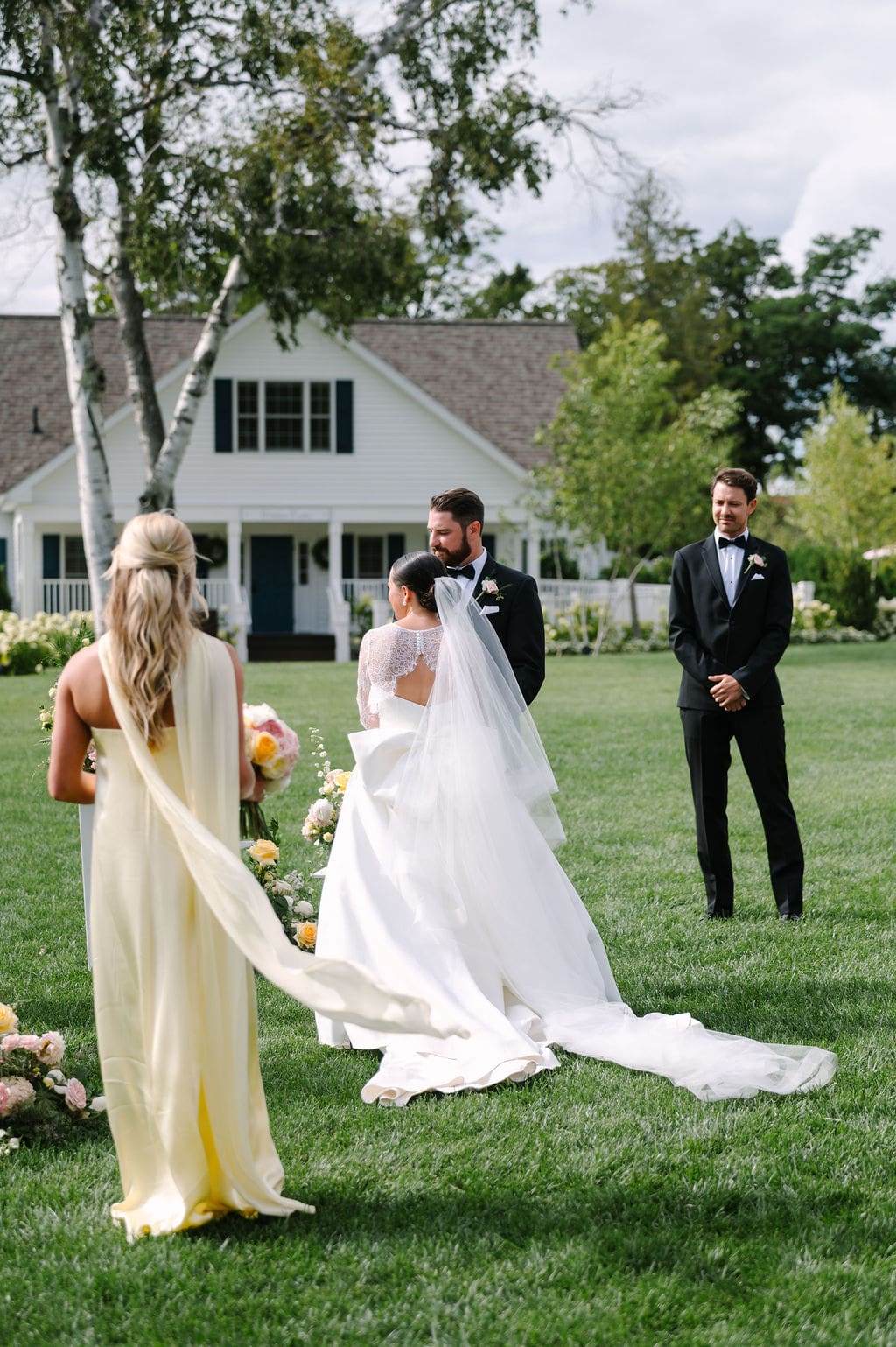 Quincey’s wedding dress featured a statement bow, blending modern sophistication with timeless design. For the ceremony and cocktail hour, Quincey styled her gown with a long-sleeve lace overlay that added a regal feel. A butter yellow bridesmaid dress and soft pink and yellow pastel florals completed the look.