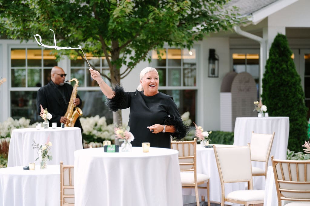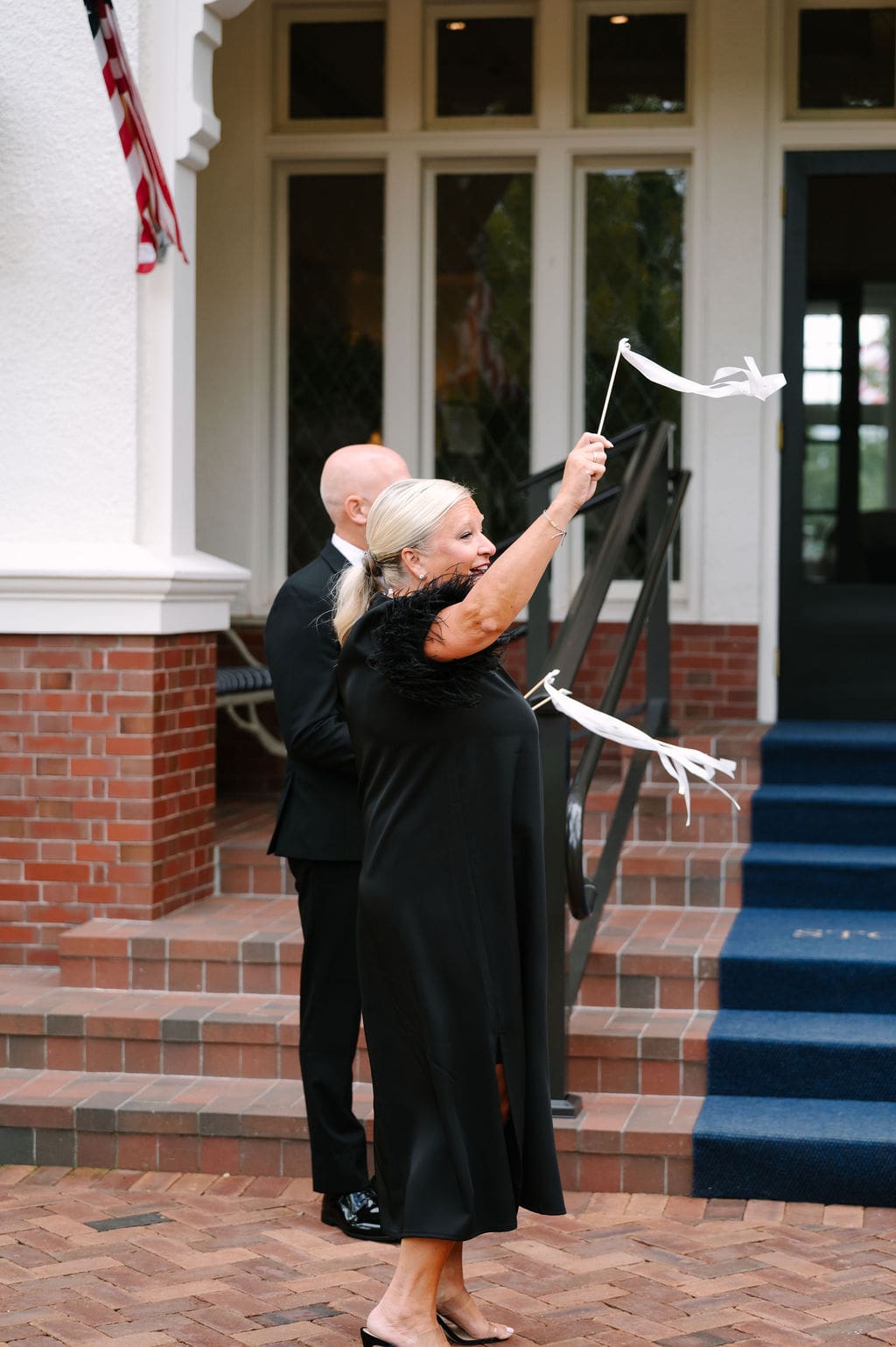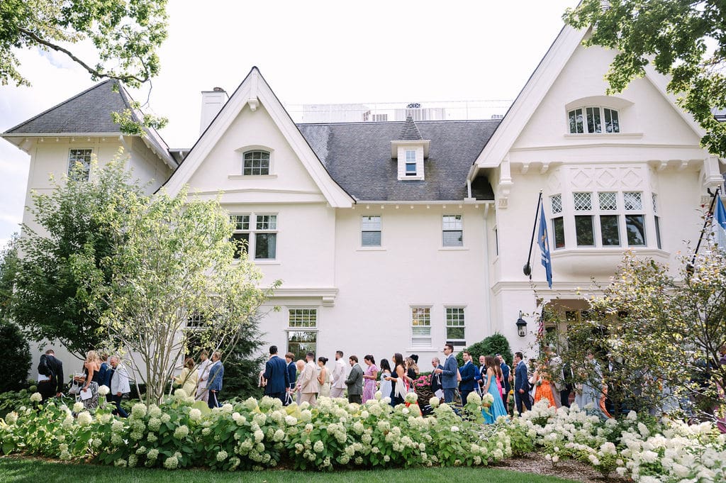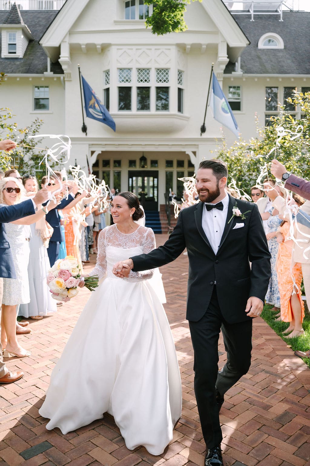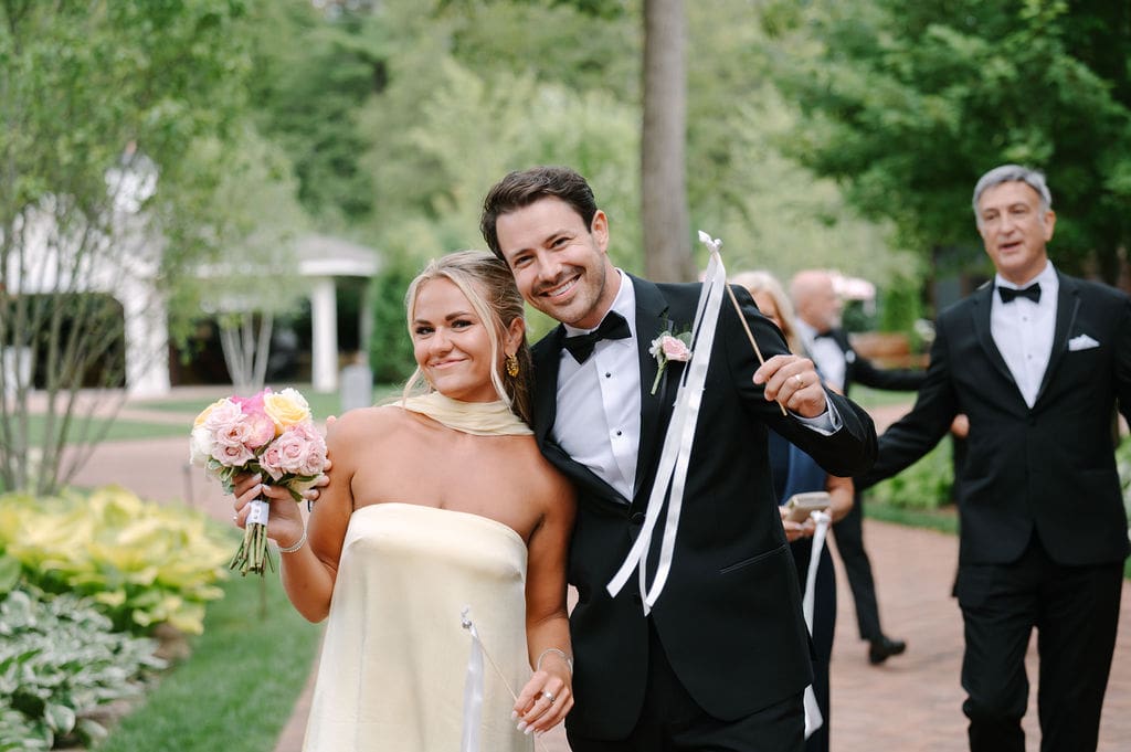 Following the ceremony, guests gathered at the front of the mansion for a joyful exit featuring bell and ribbon wands.